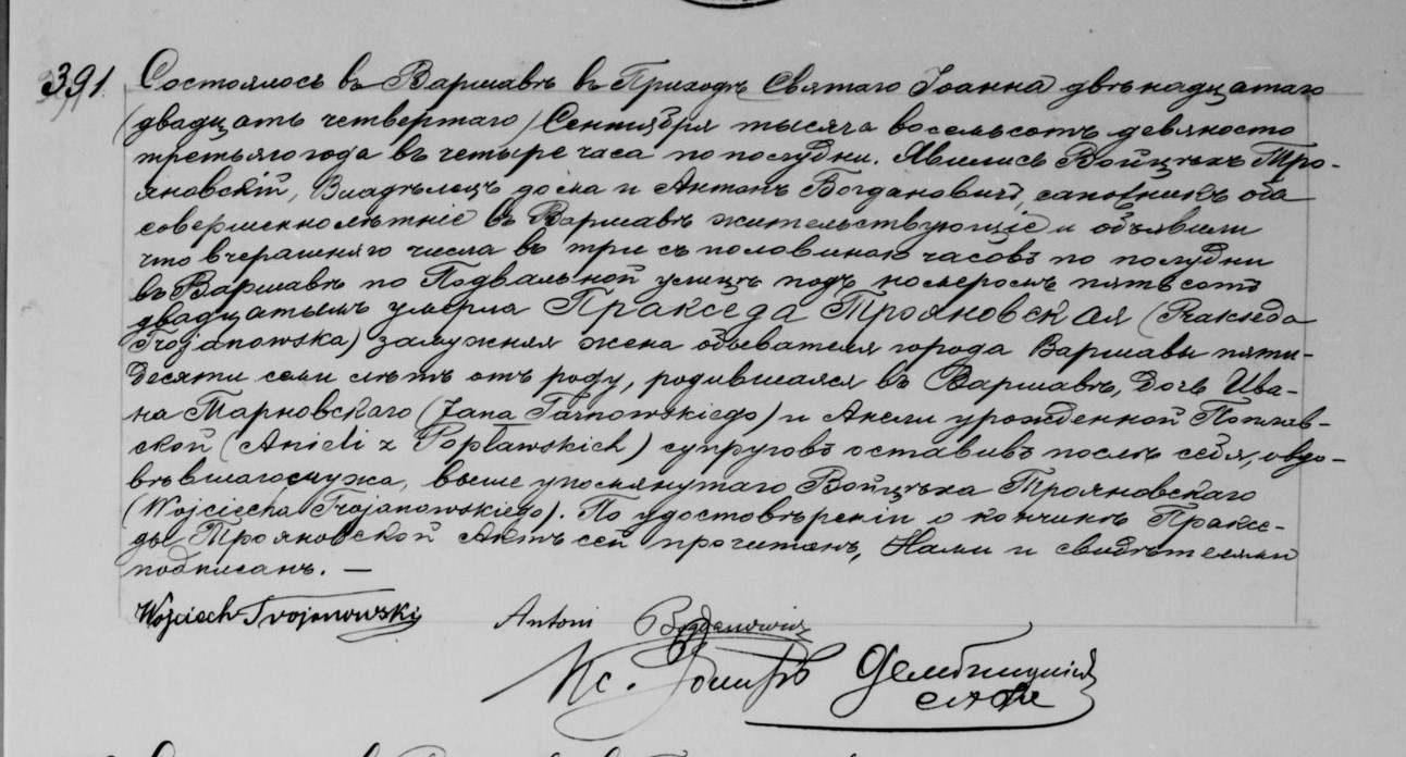 | sw.342222 | f | Prakseda | | | | | Tarnowski | | | | | Akt małżeństwa: Warszawa św. Aleksander (obecn. m. Warszawa), 327/1901 [indeks na http://geneteka.genealodzy.pl/] http://metryki.genealodzy.pl/metryka.php?ar=1&zs=0162d&sy=1901b&kt=2&skan=326-327.jpg [podgląd] |