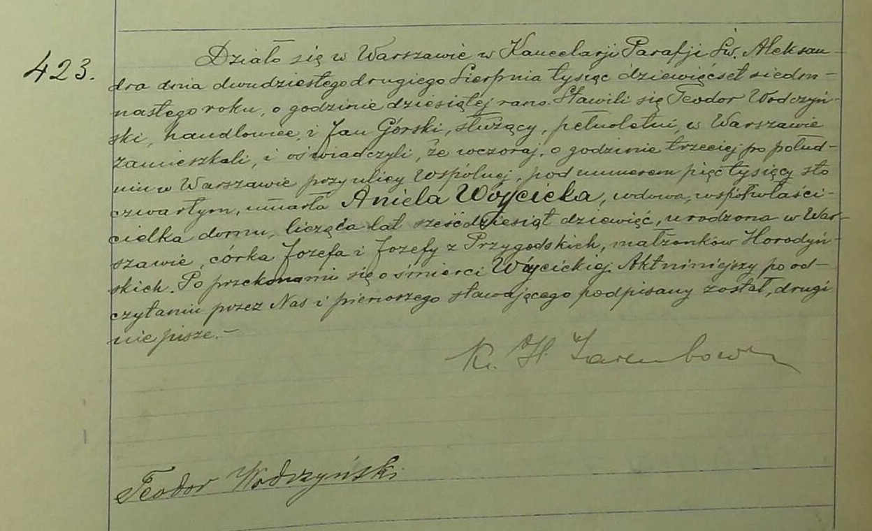 | genetekaz.11454481 | 21 | aug | 1917 | | xpar.1442 | Akt zgonu: Warszawa św. Aleksander (obecn. m. Warszawa), 423/1917 http://localhost/mjm/aleksander_1917_418-423.jpg [podglad] | | Akt zgonu obecny w bazie Geneteka |