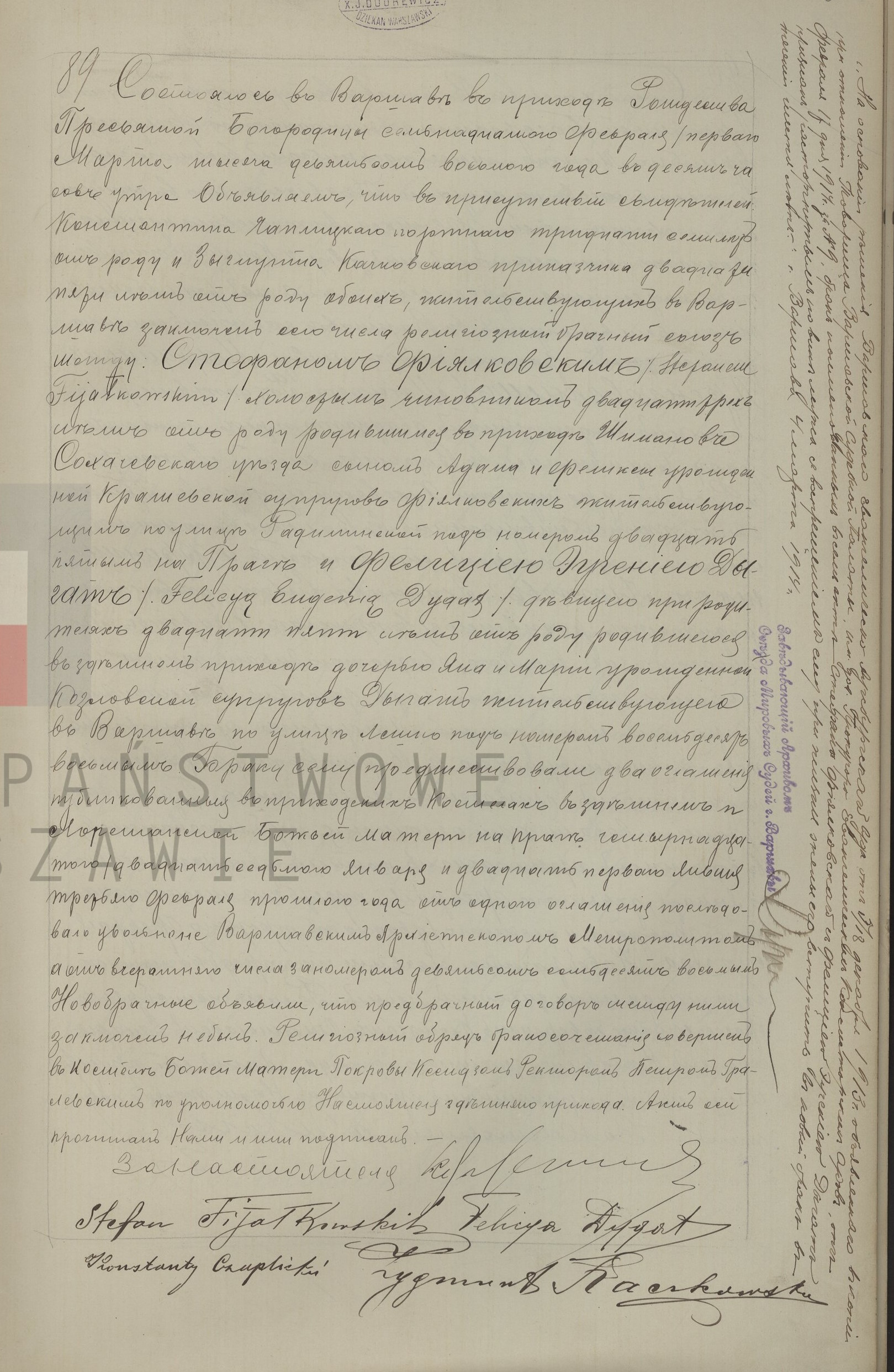 | sw.1022080 | sw.48907 (sw.48907) | | | 1907 | | xpar.1446 | Akt małżeństwa: Warszawa św. Barbara (obecn. m. Warszawa), rok 1907, nr aktu 84 [indeks na http://geneteka.genealodzy.pl/] https://metryki.genealodzy.pl/ar1-zs1214d-sy1907b-kt2 [podgląd] | | | Akt ślubu obecny w bazie Geneteka |