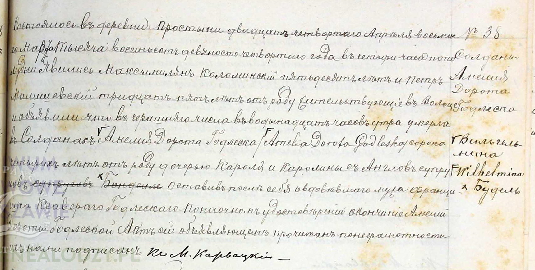 | sw.1308798 | sw.1308798 | sw.1022102 (sw.1022102) | sw.1022105 (sw.1022105) | Akt małżeństwa: Prostyń (obecn. woj. mazow.), 10/1911 [indeks na http://geneteka.genealodzy.pl/] http://metryki.genealodzy.pl/metryki.php?op=kt&ar=6&zs=0134d&sy=1911 [podgląd] |