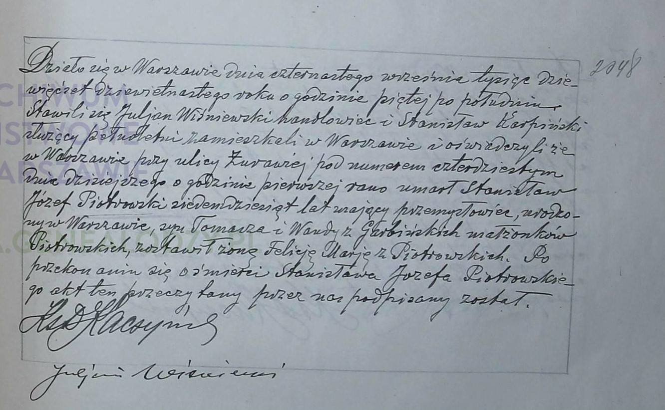 | sw.1137353 | f | Felicja | Maria | | | | Piotrowski | | | | | Akt małżeństwa: Warszawa św. Krzyż (obecn. m. Warszawa), 326/1914 [indeks na http://geneteka.genealodzy.pl/] https://szukajwarchiwach.gov.pl/jednostka/-/jednostka/12478085 [podgląd] |
