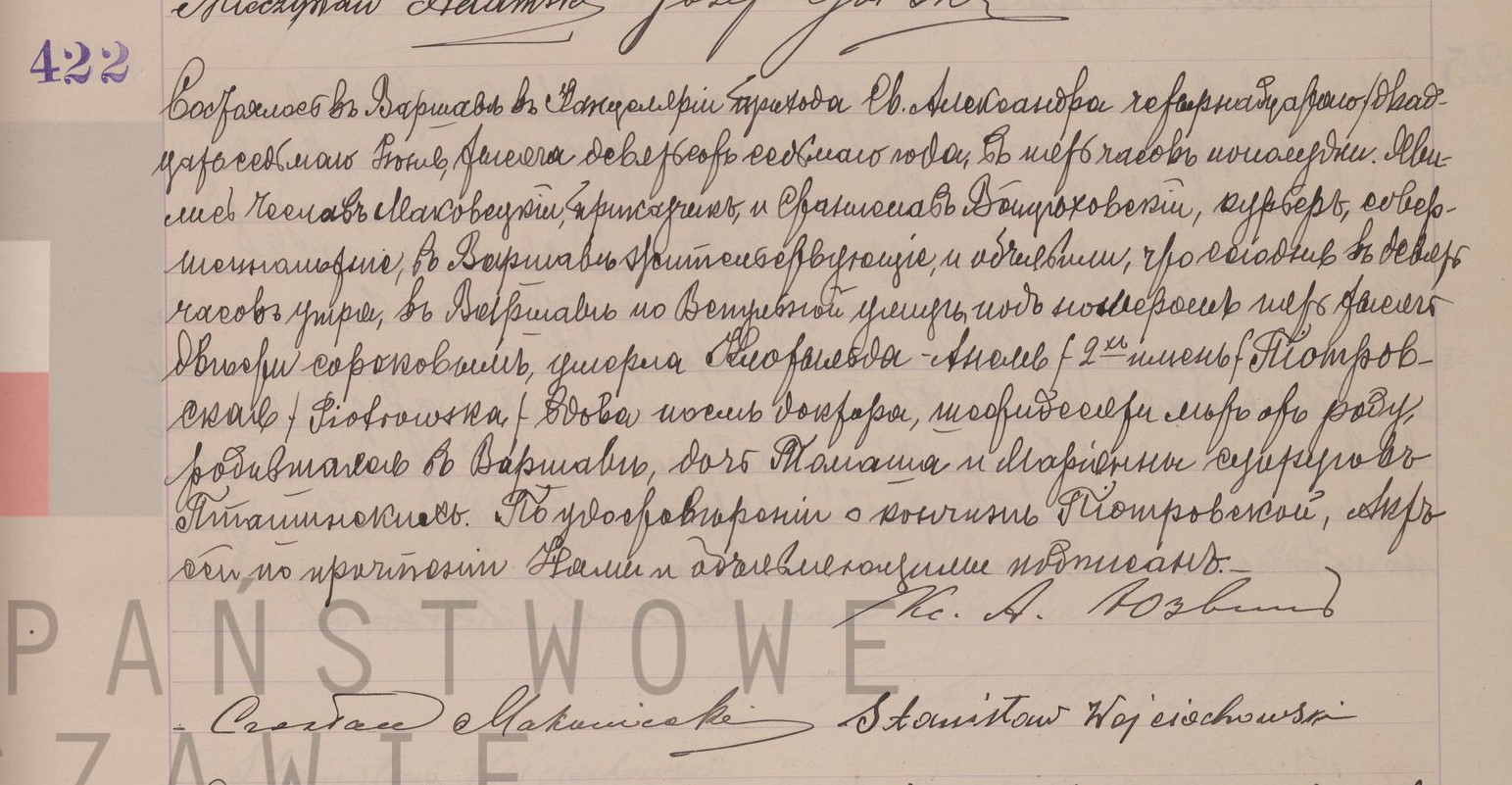 | sw.1057907 | sw.1057908 (sw.1057908) | sw.1057909 (sw.1057909) | Akt zgonu: Warszawa św. Aleksander (obecn. m. Warszawa), 422/1907 [indeks na http://geneteka.genealodzy.pl/] http://localhost/mjm/aleksander_1907_159_35_0391.jpg [podgląd] |