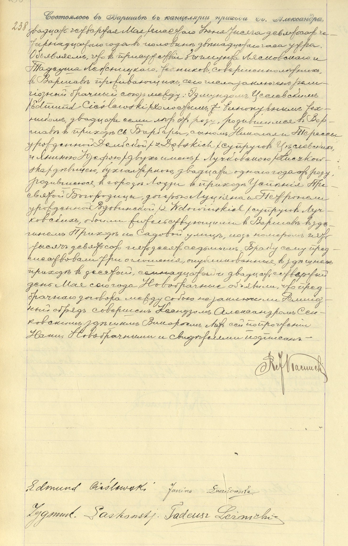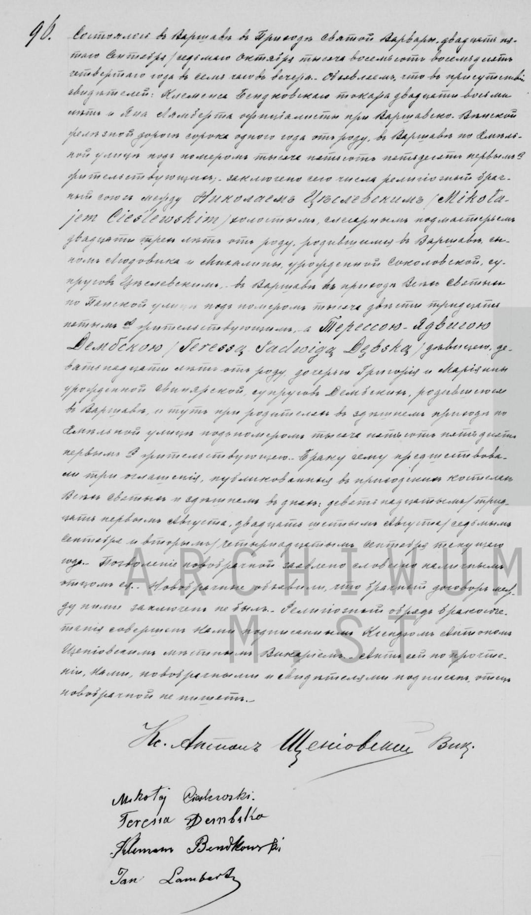 | sw.1025303 | sw.1102485 | sw.1102486 (sw.1071050) | sw.1102487 (sw.1102487) | Akt małżeństwa: Warszawa św. Aleksander (obecn. m. Warszawa), 238/1914 [indeks na http://geneteka.genealodzy.pl/] http://metryki.genealodzy.pl/metryka.php?ar=8&zs=9214d&sy=330&kt=1&skan=238.jpg [podgląd] |