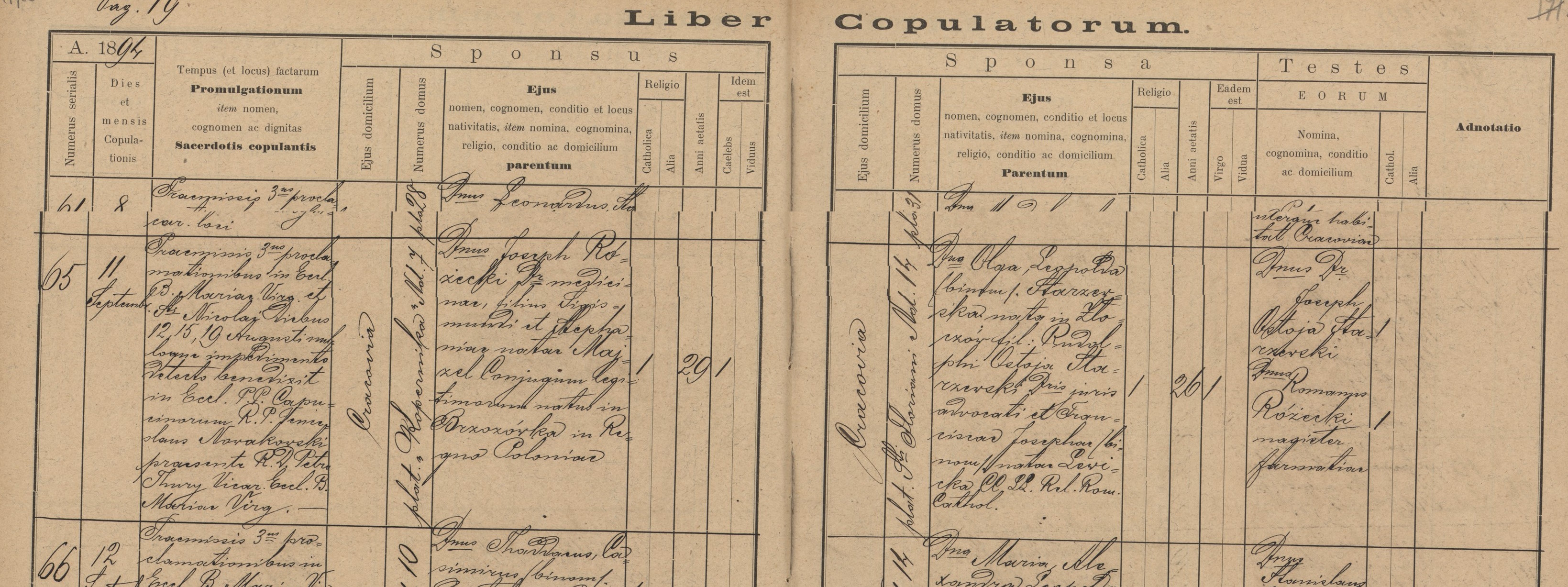 | sw.1277204 | sw.1277204 | sw.1085961 (sw.1085961) | sw.1085962 (sw.1085962) | Akt małżeństwa: Kraków WNMP (Mariacki) (obecn. woj. małop.), 65/1894 [indeks na http://geneteka.genealodzy.pl/] https://szukajwarchiwach.gov.pl/en/jednostka/-/jednostka/14604824 [podgląd] |