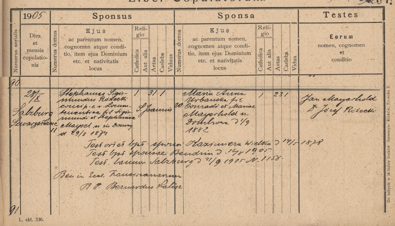 | sw.1279160 | sw.1279160 | sw.1085961 (sw.1085961) | sw.1085962 (sw.1085962) | Akt małżeństwa: Kraków WNMP (Mariacki) (obecn. woj. małop.), 91/1905 [indeks na http://geneteka.genealodzy.pl/] https://szukajwarchiwach.gov.pl/jednostka/-/jednostka/14604825 [podgląd] |