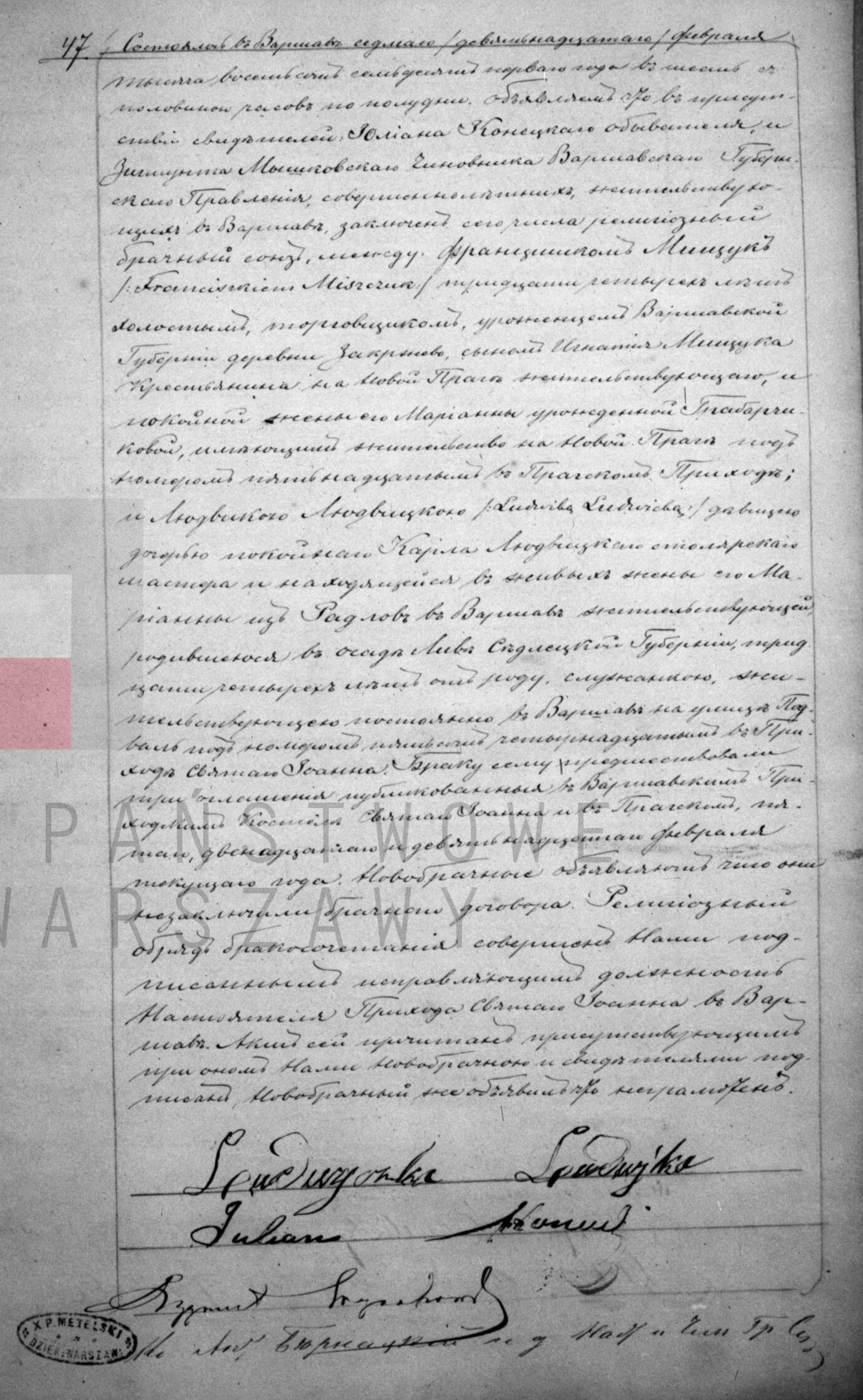 | sw.1181236 | sw.1181236 | sw.1094920 (sw.1094920) | sw.1094921 (sw.1094921) | Akt małżeństwa: Warszawa św. Jan (obecn. m. Warszawa), 47/1871 [indeks na http://geneteka.genealodzy.pl/] http://metryki.genealodzy.pl/metryki.php?op=kt&ar=1&zs=0161d&sy=1871&kt=2 [podgląd] |