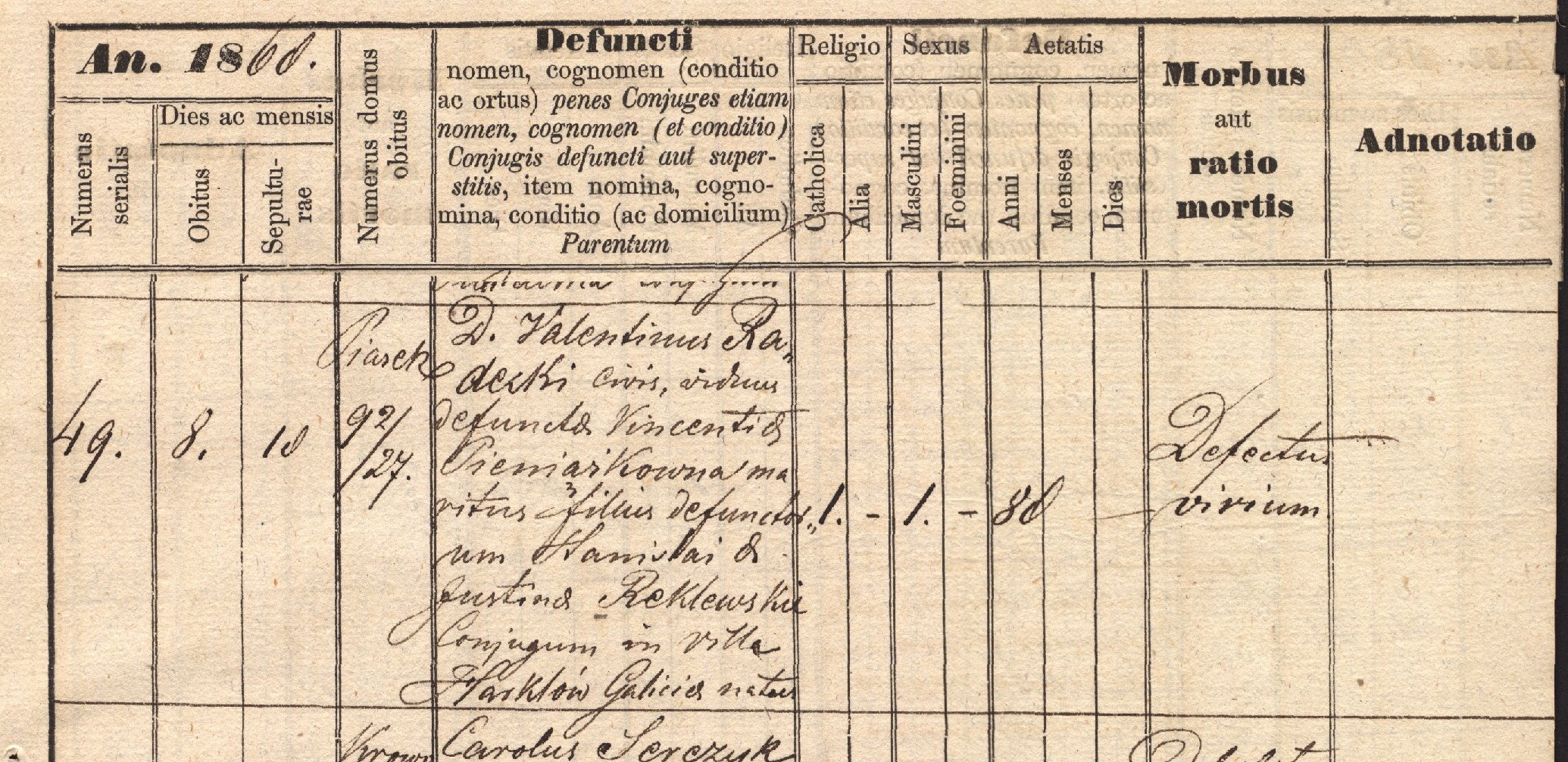 | sw.500759 | sw.1019493 (sw.109536) | | | | | | | | | Akt zgonu: Kraków św. Szczepana (obecn. woj. małop.), 122_49/1860 [indeks na http://geneteka.genealodzy.pl/] https://szukajwarchiwach.pl/29/331/0/2#tabZespol [podgląd] |