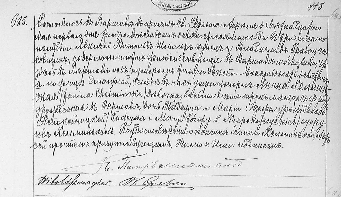 | genetekaz.11420457 | 1 | may | 1897 | | xpar.1450 | Akt zgonu: Warszawa św. Krzyż (obecn. m. Warszawa), 685/1897 http://localhost/mjm/krzyz_1897_161_162_0637.jpg [podglad] | | Akt zgonu obecny w bazie Geneteka |