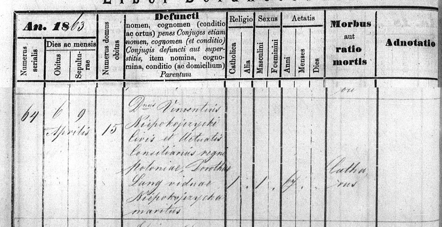 | genetekaz.11764584 | 6 | apr | 1863 | | xpar.481 | Akt zgonu: Kraków, par. Mariacka (obecn. woj. małop.), 64/1863 [podglad] | | Akt zgonu obecny w bazie Geneteka |