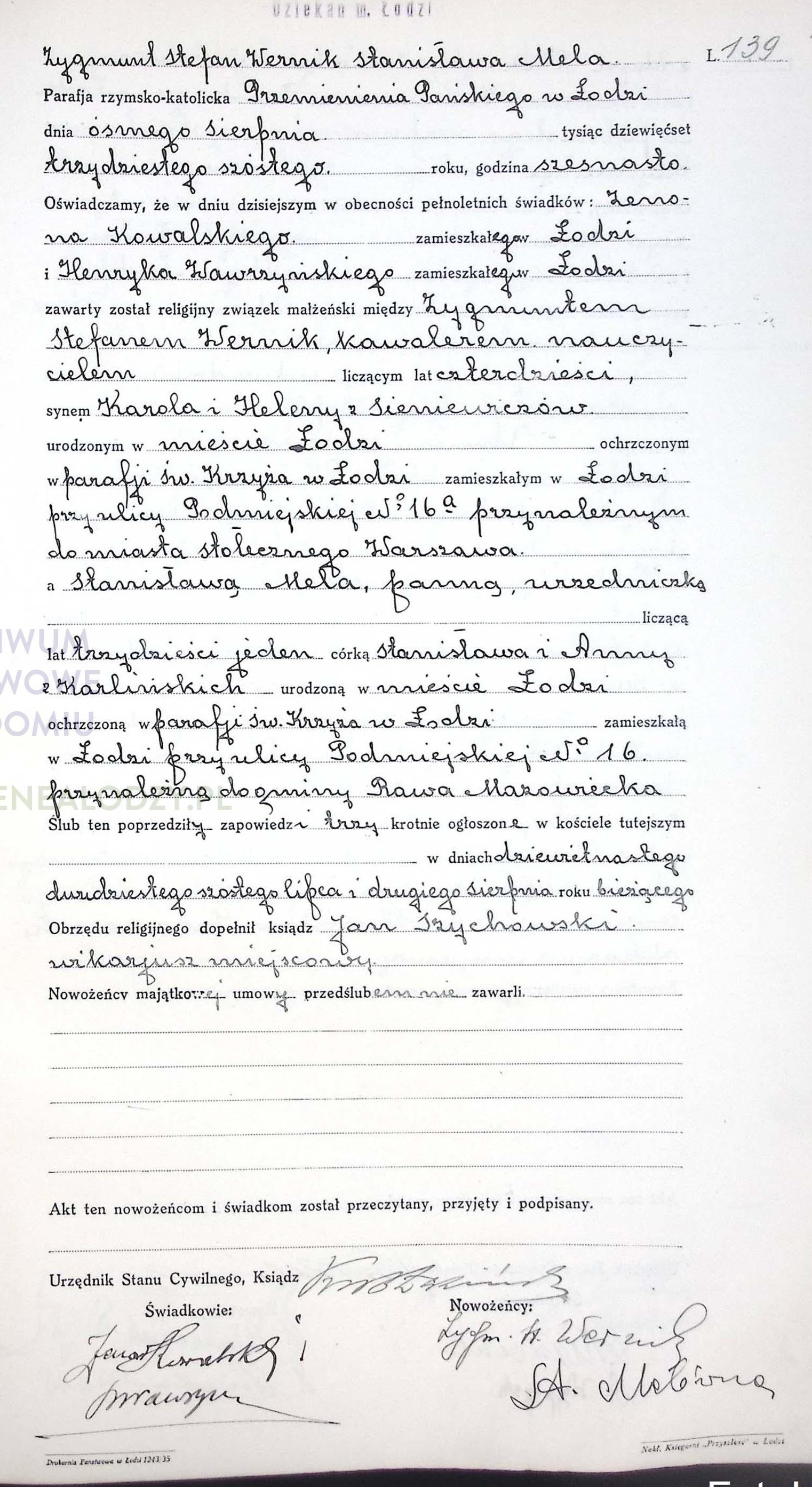 | sw.1313978 | sw.1313978 | sw.1156477 (sw.1156477) | sw.1156478 (sw.1156478) | Akt małżeństwa: Łódź św. St. Kostka (obecn. woj. łódz.), 255/1924 [indeks na http://geneteka.genealodzy.pl/] http://metryki.genealodzy.pl/metryki.php?op=kt&ar=3&zs=2470d&sy=1924b&kt=1 [podgląd] |