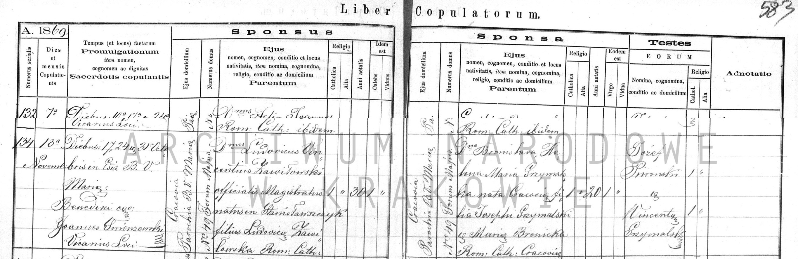 | sw.1347460 | sw.1347460 | sw.1322787 (sw.1322787) | sw.1309710 (sw.1309710) | Akt małżeństwa: Kraków WNMP (Mariacki) (obecn. woj. małop.), 134/1869 [indeks na http://geneteka.genealodzy.pl/] https://szukajwarchiwach.gov.pl/jednostka/-/jednostka/14604822 [podgląd] |