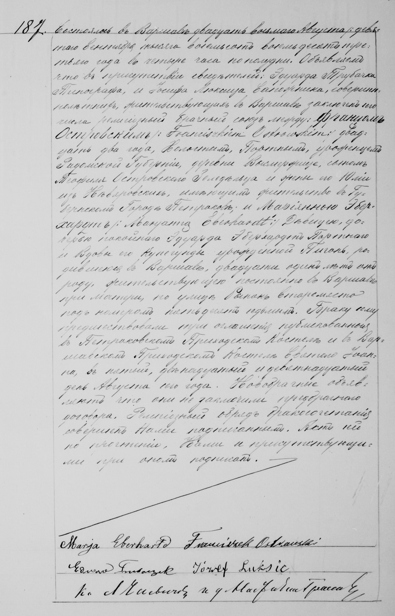 | sw.1302741 | sw.1358607 | sw.1316579 (sw.1316579) | sw.1316582 (sw.1316582) | Akt małżeństwa: Warszawa św. Jan (obecn. m. Warszawa), 187/1883 [indeks na http://geneteka.genealodzy.pl/] http://metryki.genealodzy.pl/metryka.php?ar=1&zs=0161d&sy=1883&kt=2&skan=186-187.jpg [podgląd] |