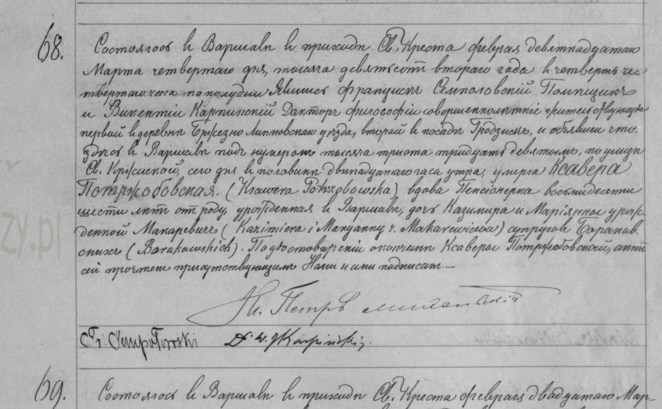 | genetekaz.11248328 | 4 | mar | 1902 | | xpar.1450 | Akt zgonu: Warszawa św. Krzyż (obecn. m. Warszawa), 68/1902 http://metryki.genealodzy.pl/metryki.php?op=kt&ar=1&zs=0158d&sy=1902&kt=3 [podglad] | | Akt zgonu obecny w bazie Geneteka |
