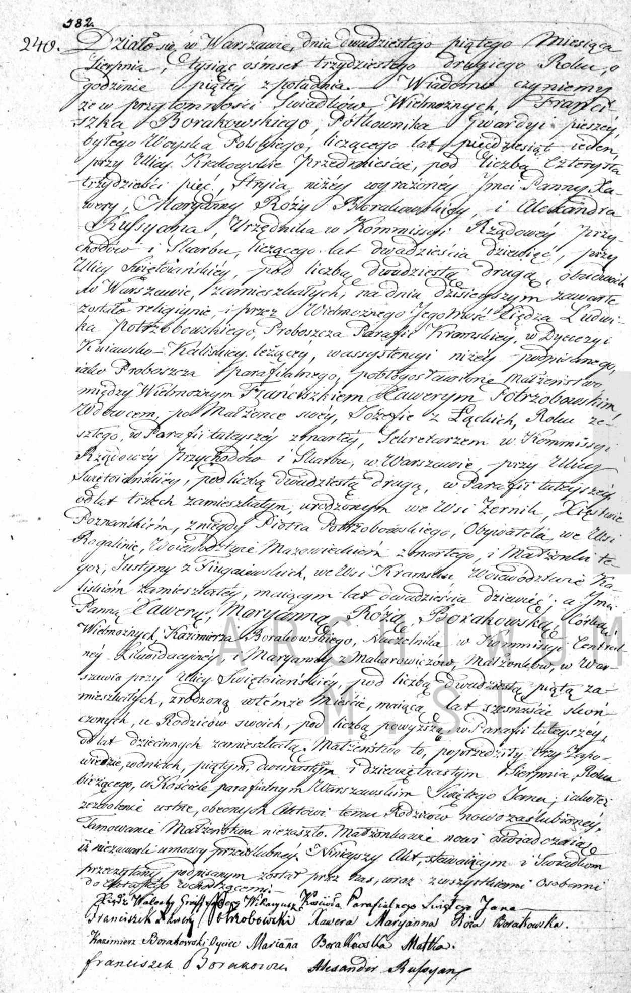 | sw.151998 | sw.151997 (sw.151997) | 1832 | xpar.1448 | Akt małżeństwa: Warszawa św. Jan (obecn. m. Warszawa), rok 1832, nr aktu 240 [indeks na http://geneteka.genealodzy.pl/] http://metryki.genealodzy.pl/metryka.php?ar=8&zs=9233d&sy=317&kt=2&skan=240-241.jpg [podgląd] | Akt ślubu obecny w bazie Geneteka | |||||