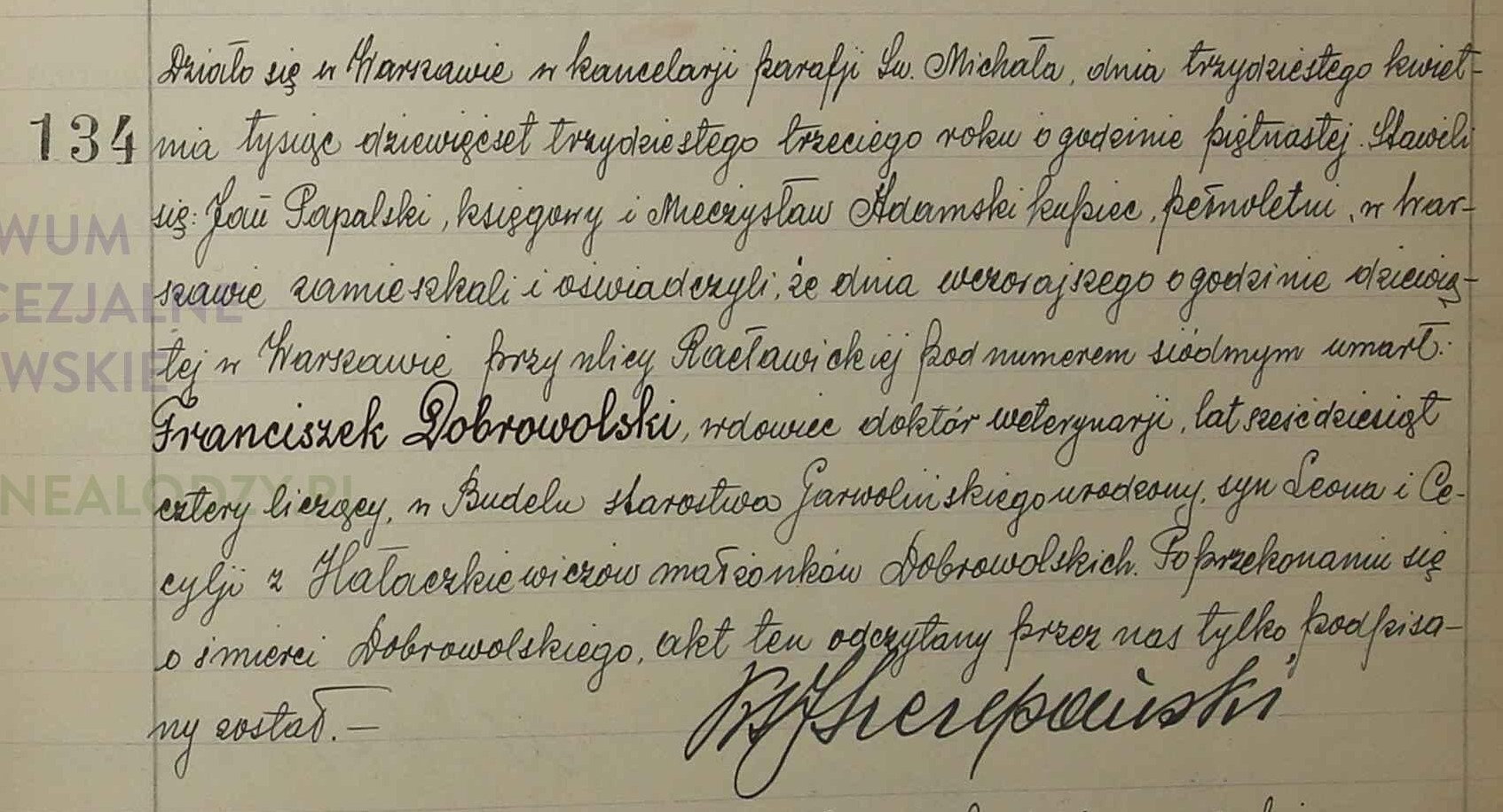 | sw.1046633 | sw.1046633 | 4.542.22 (4.542.22) | sw.154546 (sw.154546) | Akt zgonu: Warszawa-Mokotów św. Michał (obecn. m. Warszawa), 134/1933 [indeks na http://geneteka.genealodzy.pl/] http://metryki.genealodzy.pl/ar8-zs9247d [podgląd] |