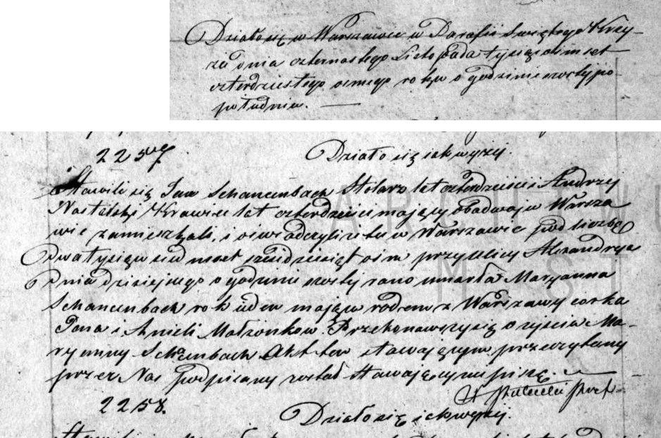 | sw.163181 | m | Jan | | | | | Schancenbach | | | | | Akt małżeństwa: Warszawa św. Krzyż (obecn. m. Warszawa), 273/1885 [indeks na http://geneteka.genealodzy.pl/] http://metryki.genealodzy.pl/metryki.php?op=kt&ar=1&zs=0158d&sy=1885b&kt=2 [podgląd] |