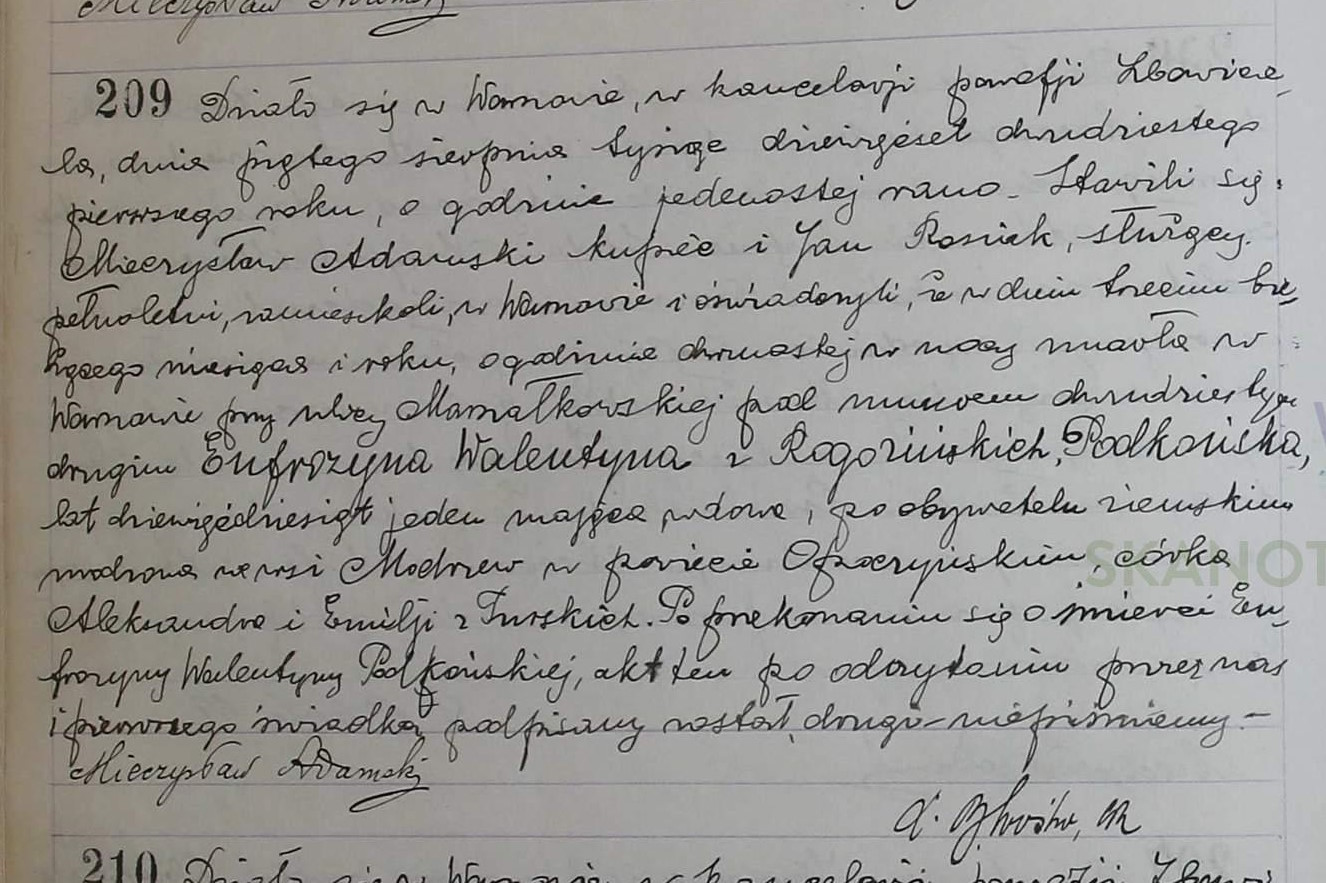 | sw.164030 | 1837 | żeni się | Akt małżeństwa: Warszawa św. Andrzej (obecn. m. Warszawa), 209/1862 [indeks na http://geneteka.genealodzy.pl/] http://metryki.genealodzy.pl/metryki.php?op=kt&ar=1&zs=0159d&sy=1862&kt=2 [podgląd] | |||||