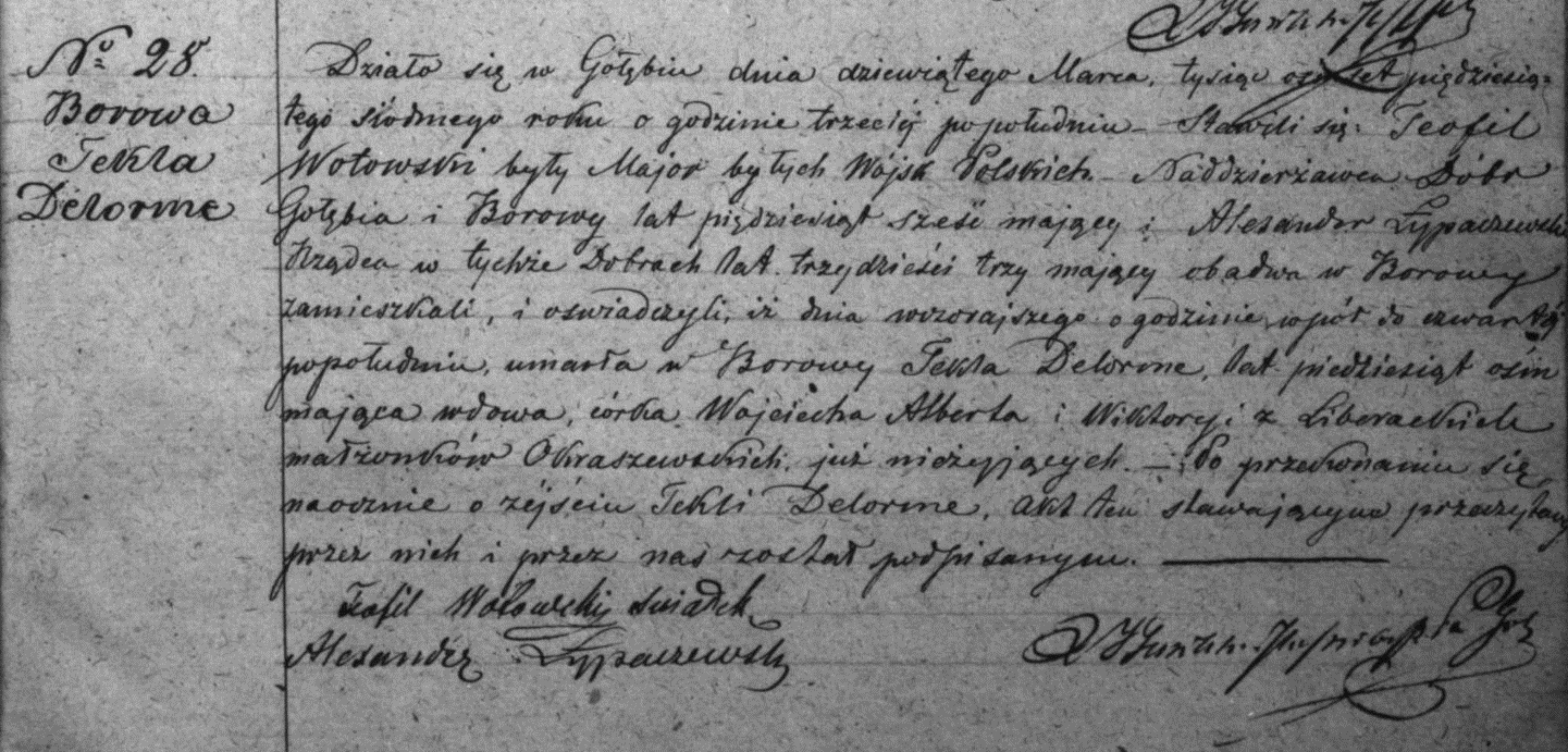 | sw.640768 | f | Tekla | | | | | | | | | | Akt zgonu: Gołąb (obecn. woj. lubel.), 28/1857 [indeks na http://lubgens.eu/] http://szukajwarchiwach.pl/35/1818/0/2.4/93/skan/full/y7JWh3afjPovCj_wO4Yrnw [podgląd] |