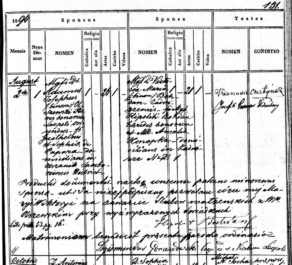 | sw.173212 | sw.173213 (sw.173213) | 2 | aug | 1890 | xpar.3860 | Akt małżeństwa: Gliniany (obecn. Ukraina), rok 1890, nr aktu [bez nru] [indeks na http://geneteka.genealodzy.pl/] http://agadd.home.net.pl/metrykalia/301/sygn.%201699/pages/PL_1_301_1699_0084.htm [podgląd] | Akt ślubu obecny w bazie Geneteka |