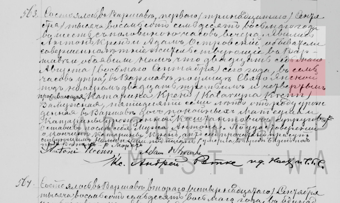 | sw.174168 | f | Katarzyna | | | | | Morat | | | | | Akt małżeństwa: Warszawa św. Jan (obecn. m. Warszawa), 194/1876 [indeks na http://geneteka.genealodzy.pl/] http://metryki.genealodzy.pl/metryka.php?ar=1&zs=0161d&sy=1876&kt=2&skan=194-195.jpg [podgląd] |