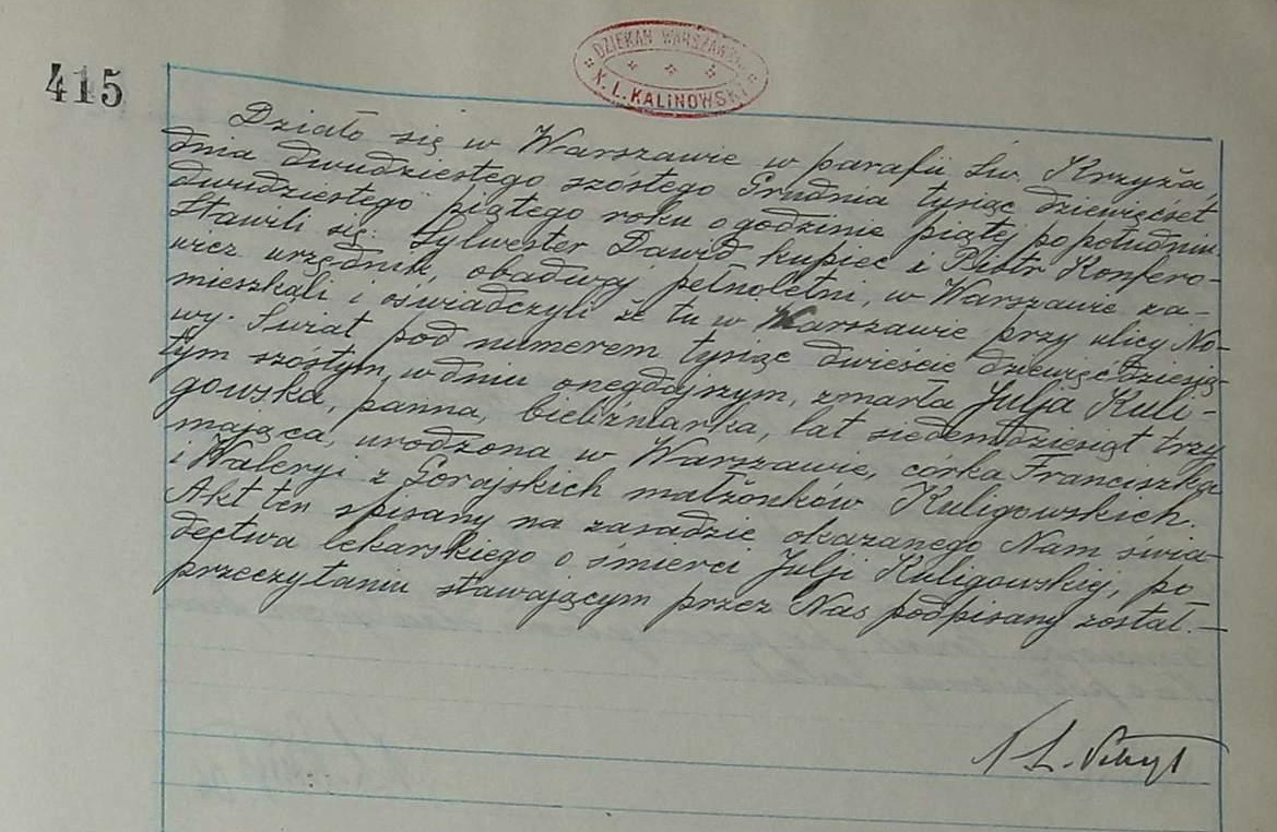 | sw.179254 | | | 1879 | | | | rodzi mu się dziecko | Akt małżeństwa: Warszawa Wsz. Św. (obecn. m. Warszawa), 474/1901 [indeks na http://geneteka.genealodzy.pl/] http://metryki.genealodzy.pl/metryka.php?ar=8&zs=9264d&sy=325&kt=1&skan=474.jpg [podgląd] |