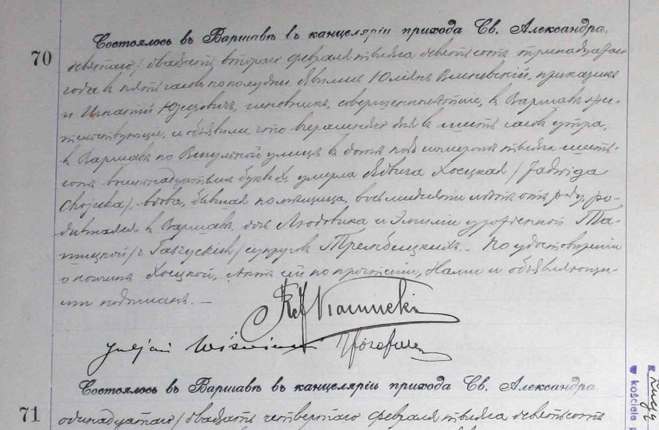 | sw.225763 | sw.226256 | sw.226257 (sw.18067) | sw.226258 (sw.18066) | Akt małżeństwa: Warszawa Przemienienie Pańskie (obecn. m. Warszawa), 103/1875 [indeks na http://geneteka.genealodzy.pl/] http://metryki.genealodzy.pl/metryki.php?op=kt&ar=1&zs=1216d&sy=1875&kt=2 [podgląd] |