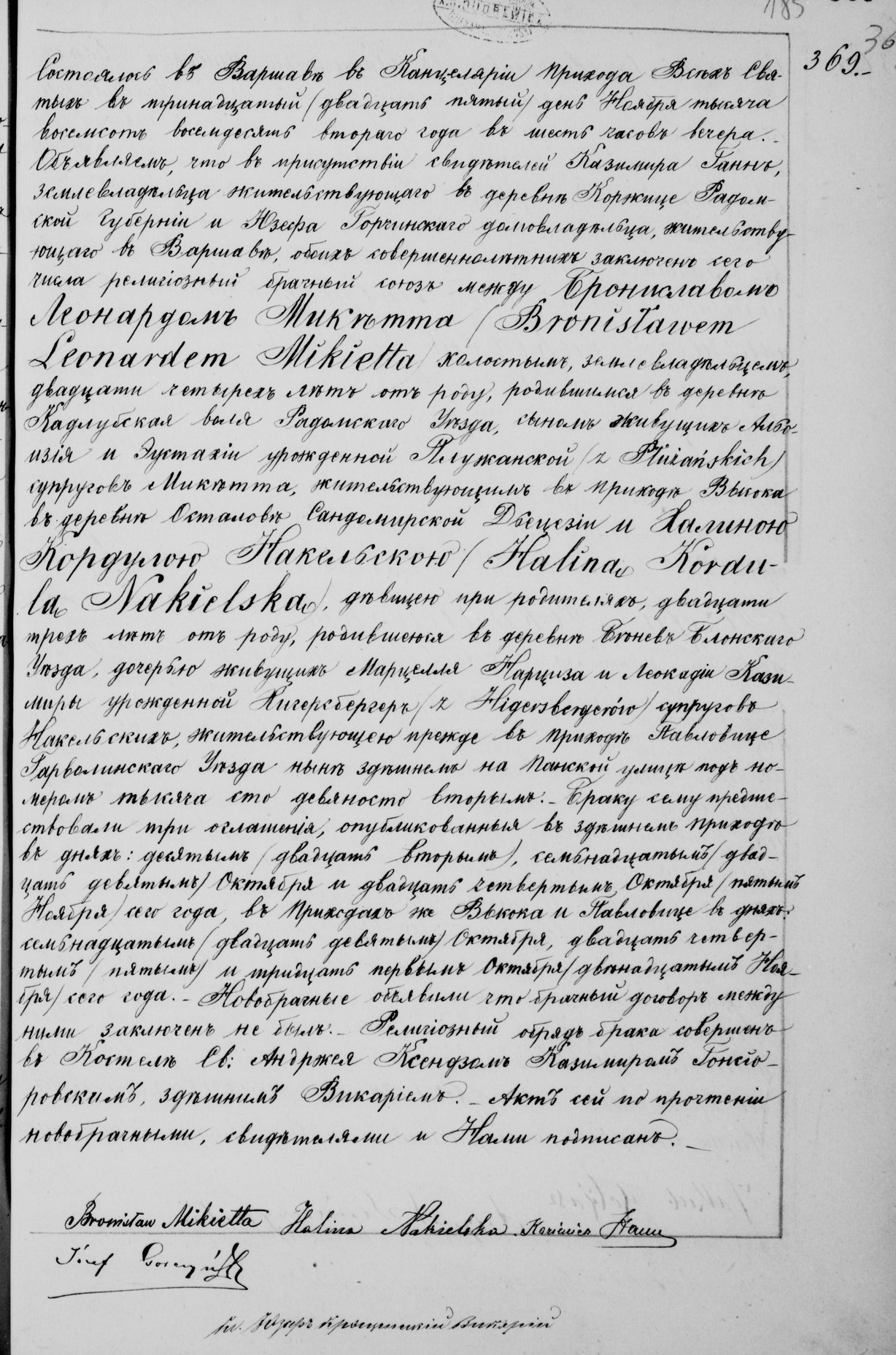 | sw.189231 | sw.189230 (sw.189230) | 1882 | xpar.1454 | Akt małżeństwa: Warszawa Wszystkich Świętych (obecn. m. Warszawa), rok 1882, nr aktu 369 [indeks na http://geneteka.genealodzy.pl/] http://metryki.genealodzy.pl/metryka.php?ar=8&zs=9264d&sy=306&kt=1&skan=369.jpg [podgląd] | Akt ślubu obecny w bazie Geneteka |