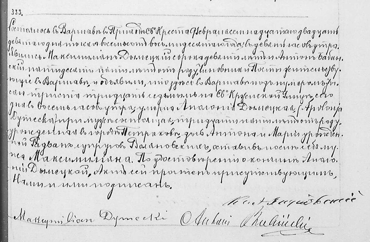 | sw.194277 | f | Apolonia | | | | | Wolanowski | | | | | Akt małżeństwa: Warszawa Wsz. Św. (obecn. m. Warszawa), 149/1895 [indeks na http://geneteka.genealodzy.pl/] http://metryki.genealodzy.pl/metryka.php?ar=8&zs=9264d&sy=319&kt=1&skan=149.jpg [podgląd] |