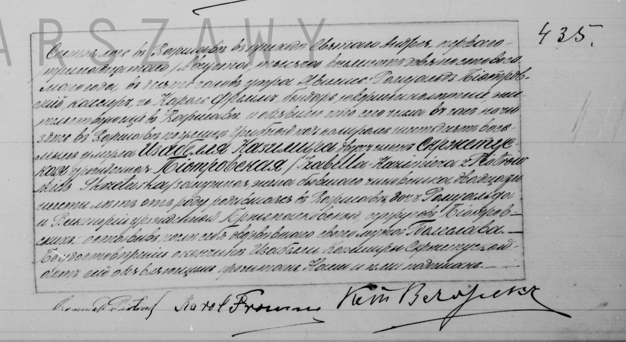 | sw.194263 | f | Izabella | Kazimiera | | | | | | | | | Akt małżeństwa: Warszawa Wsz. Św. (obecn. m. Warszawa), 101/1891 [indeks na http://geneteka.genealodzy.pl/] http://metryki.genealodzy.pl/metryka.php?ar=8&zs=9264d&sy=315&kt=1&skan=101.jpg [podgląd] |