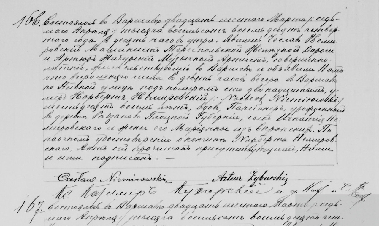 | sw.209749 | | | 1857 | | | | rodzi mu się dziecko | Akt małżeństwa: Warszawa Wsz. Św. (obecn. m. Warszawa), 20/1890 [indeks na http://geneteka.genealodzy.pl/] http://metryki.genealodzy.pl/metryka.php?ar=8&zs=9264d&sy=314&kt=1&skan=020.jpg [podgląd] |