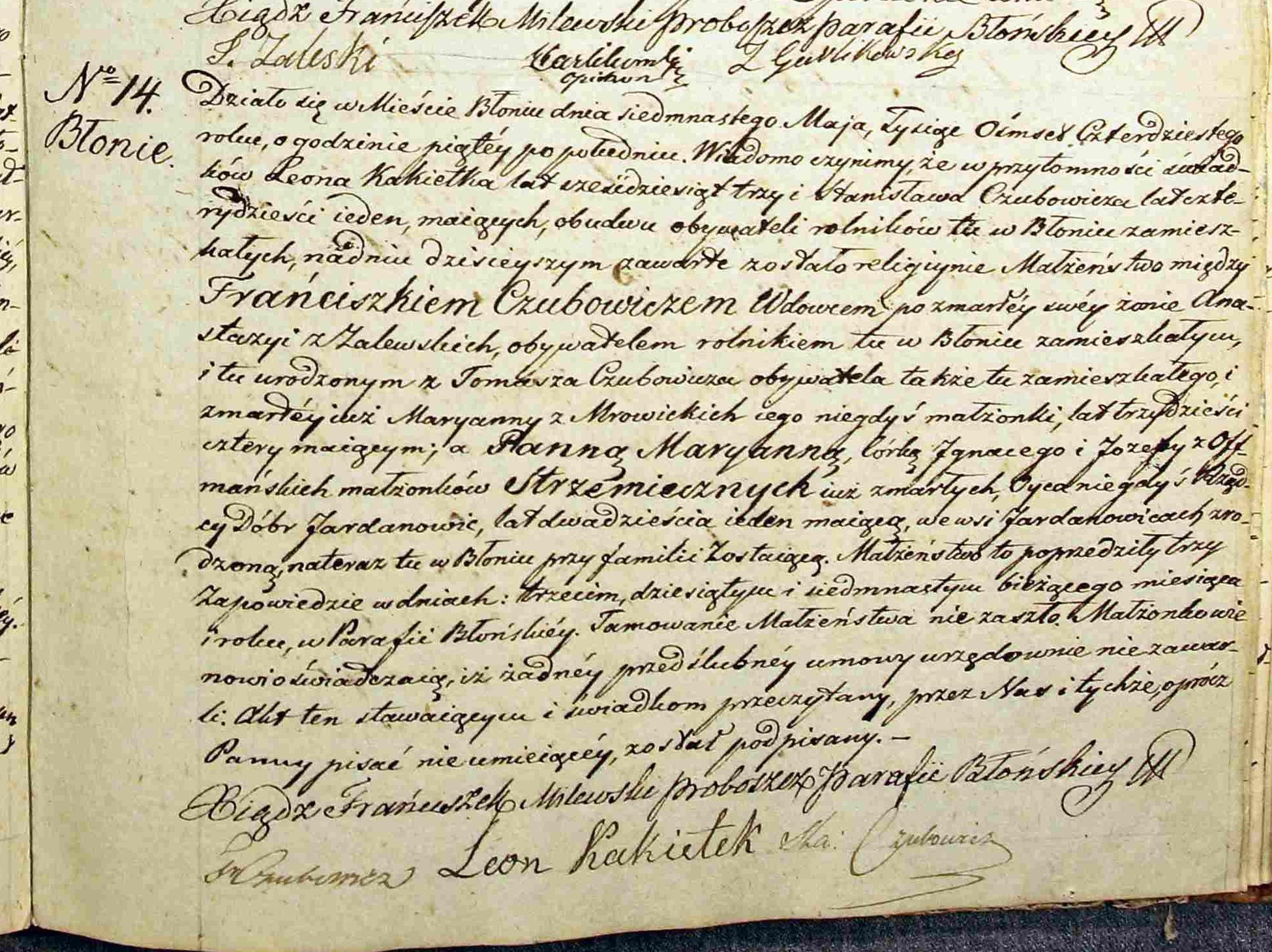 | sw.207905 | sw.210170 | sw.210171 (sw.210171) | sw.210172 (sw.210172) | Akt małżeństwa: Błonie (obecn. woj. mazow.), 18/1811 [indeks na http://geneteka.genealodzy.pl/] http://metryki.genealodzy.pl/metryka.php?ar=2&zs=0171d&sy=1811&kt=2&plik=17-18.jpg [podgląd] |
