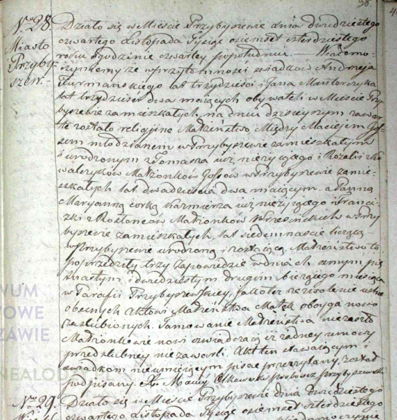 | sw.218126 | sw.218589 | sw.218590 (sw.218590) | sw.218591 (sw.218591) | Akt małżeństwa: Przybyszew (obecn. woj. mazow.), 10/1839 [indeks na http://geneteka.genealodzy.pl/] http://metryki.genealodzy.pl/metryki.php?op=kt&ar=2&op=kt&zs=1311d&sy=143&kt=2 [podgląd] |