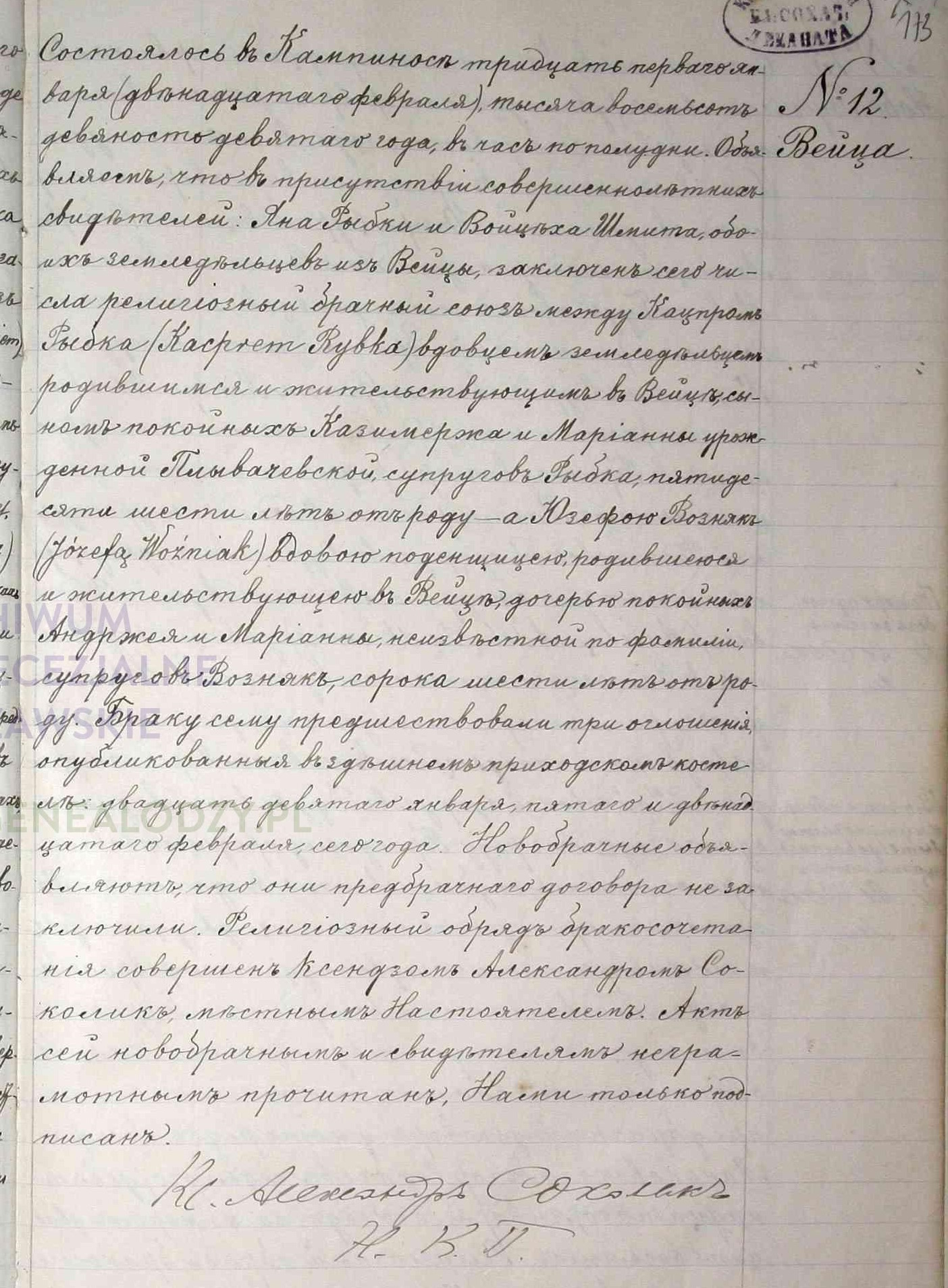 | sw.219228 | sw.383877 (sw.383877) | 12 | feb | 1899 | xpar.613 | Akt małżeństwa: Kampinos (obecn. woj. mazow.), rok 1899, nr aktu 12 [indeks na http://geneteka.genealodzy.pl/] http://metryki.genealodzy.pl/metryki.php?op=kt&ar=2&zs=1232d&sy=4250&kt=6 [podgląd] | Akt ślubu obecny w bazie Geneteka | |||