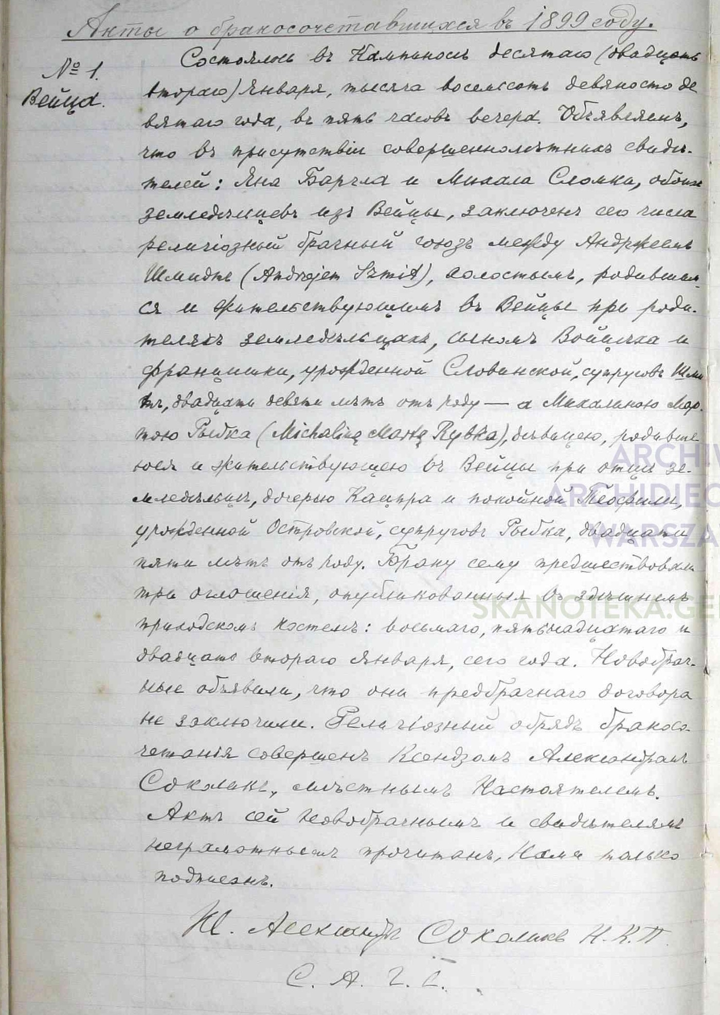 | sw.233446 | sw.233446 | sw.219228 (sw.219228) | sw.219229 (sw.219229) | Akt małżeństwa: Kampinos (obecn. woj. mazow.), 1/1899 [indeks na http://geneteka.genealodzy.pl/] http://metryki.genealodzy.pl/metryki.php?op=kt&ar=2&zs=1232d&sy=4250&kt=6 [podgląd] |