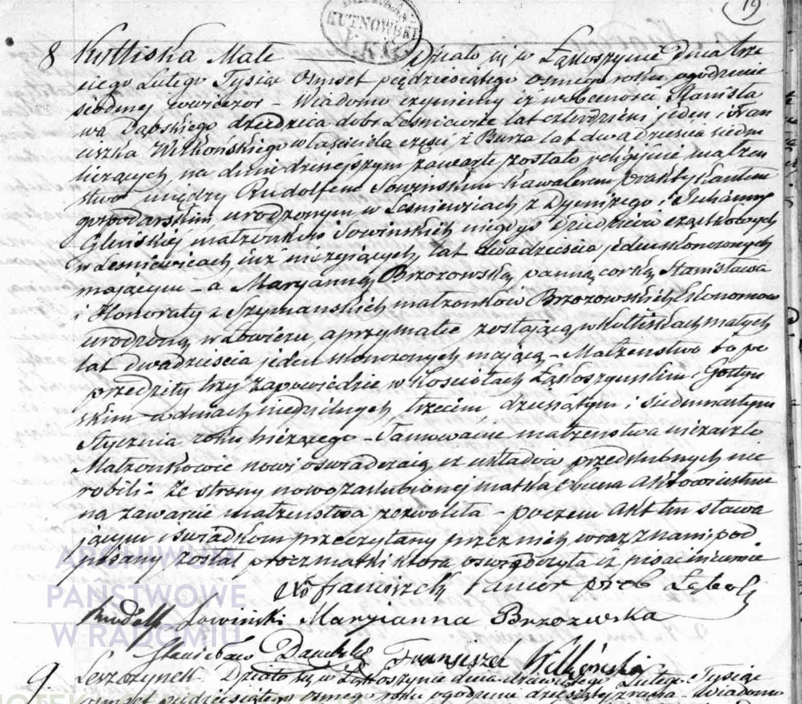| sw.221397 | | | 1820 | | | | rodzi mu się dziecko | Akt małżeństwa: Warszawa św. Aleksander (obecn. m. Warszawa), 289/1900 [indeks na http://geneteka.genealodzy.pl/] http://metryki.genealodzy.pl/metryka.php?ar=8&zs=9214d&sy=316&kt=1&skan=289.jpg [podgląd] |