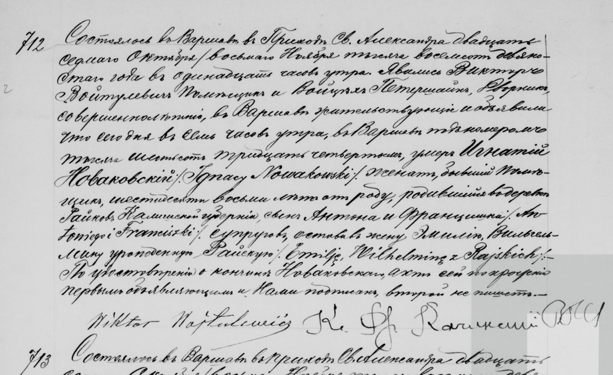 | genetekaz.3410622 | 8 | nov | 1890 | | xpar.1442 | Akt zgonu: Warszawa św. Aleksander (obecn. m. Warszawa), 712/1890 http://szukajwarchiwach.pl/72/162/0/-/114/str/1/16/100#tabSkany [podglad] | | Akt zgonu obecny w bazie Geneteka |