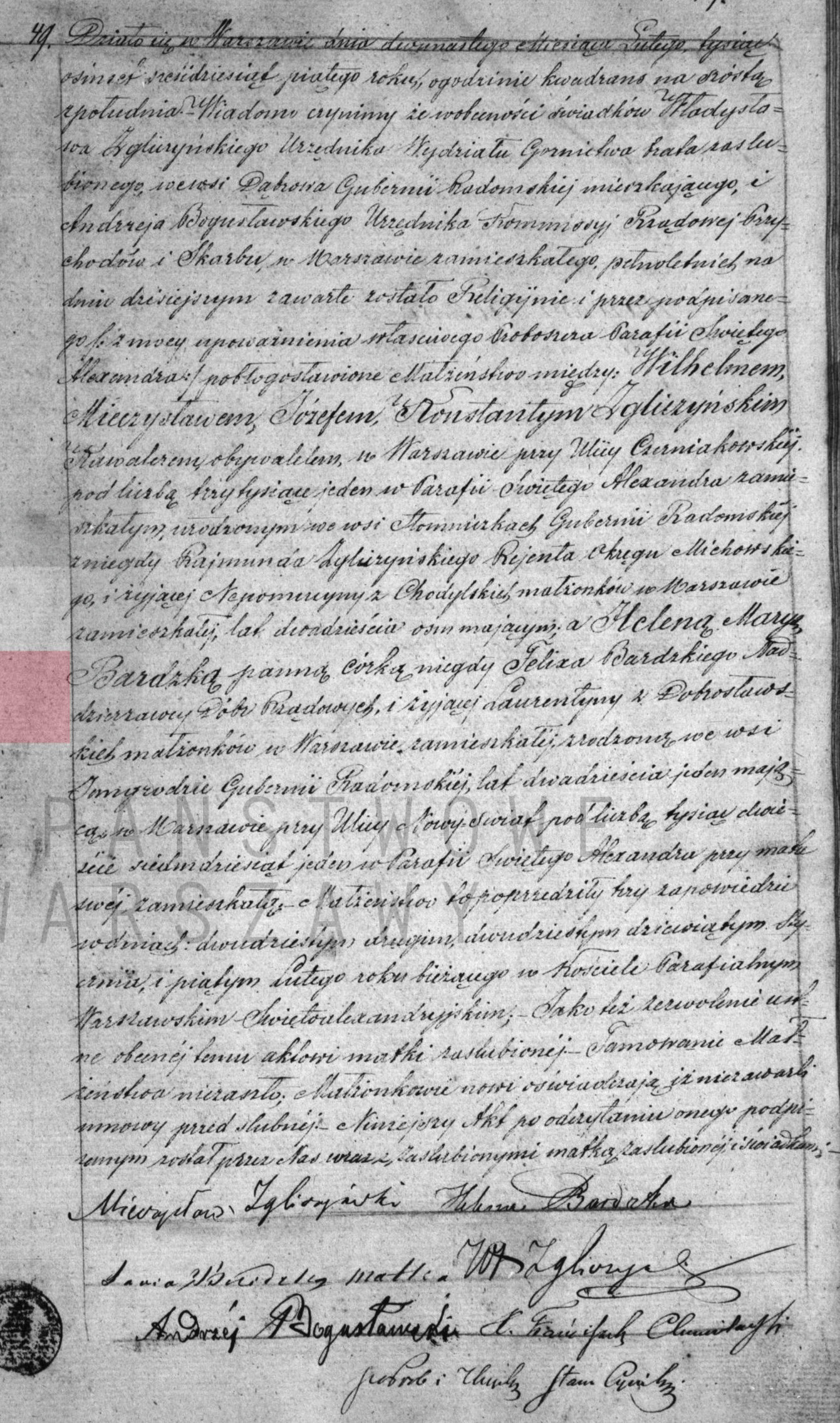 | psb.735.1 | sw.225398 | sw.225399 (sw.225399) | sw.225400 (sw.225400) | Akt małżeństwa: Warszawa św. Andrzej (obecn. m. Warszawa), I-197/1866 [indeks na http://geneteka.genealodzy.pl/] http://metryki.genealodzy.pl/metryki.php?op=kt&ar=1&zs=0159d&sy=1866a&kt=2 [podgląd] |