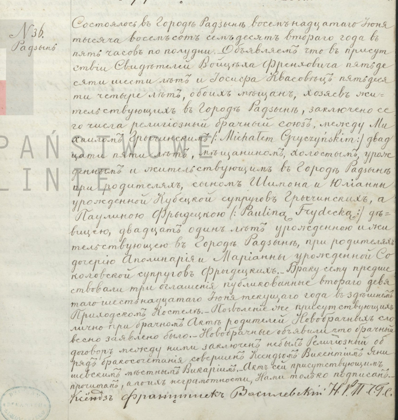 | sw.527372 | sw.527372 | sw.238941 (sw.238941) | sw.238942 (sw.238942) | Akt małżeństwa: Radzyń Podlaski (obecn. woj. lubel.), 36/1872 [indeks na http://lubgens.eu/] https://szukajwarchiwach.pl/35/1908/0/2.4/100/skan/full/6uJyztrLwECFX0gw0dE37g [podgląd] |