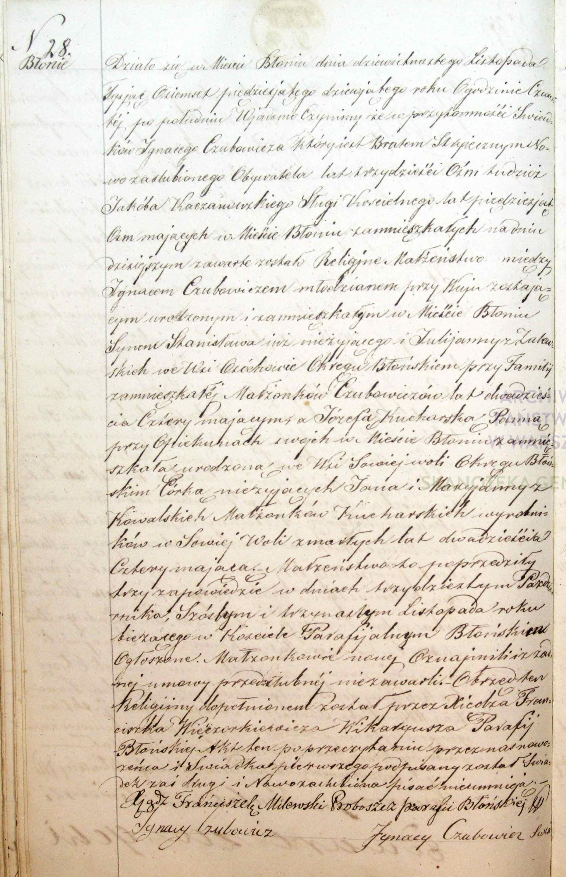 | sw.241103 | sw.210171 (sw.210171) | sw.210172 (sw.210172) | Akt małżeństwa: Błonie (obecn. woj. mazow.), 7/1819 [indeks na http://geneteka.genealodzy.pl/] http://metryki.genealodzy.pl/metryki.php?op=kt&ar=2&zs=0171d&sy=1819&kt=2 [podgląd] |