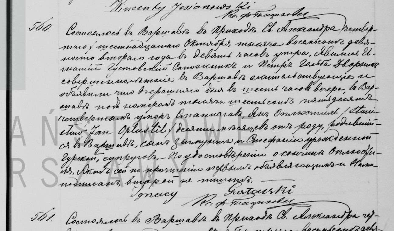 | sw.241224 | sw.239175 (sw.239175) | 1887 | xpar.1442 | Akt małżeństwa: Warszawa św. Aleksander (obecn. m. Warszawa), rok 1887, nr aktu 128 [indeks na http://geneteka.genealodzy.pl/] http://metryki.genealodzy.pl/metryki.php?op=kt&ar=1&zs=0162d&sy=1887&kt=2 [podgląd] | Akt ślubu obecny w bazie Geneteka | |||||