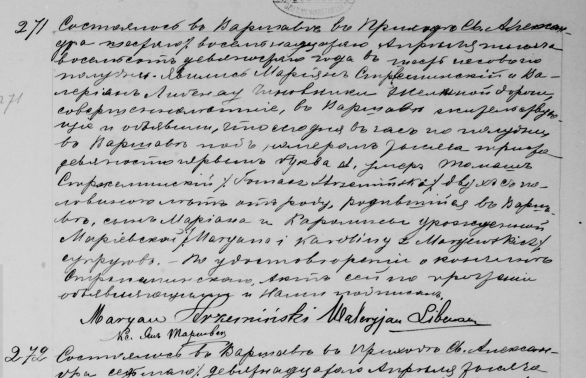 | sw.264550 | sw.264551 (sw.264551) | sw.264552 (sw.264552) | Akt małżeństwa: Warszawa św. Krzyż (obecn. m. Warszawa), 174/1873 [indeks na http://geneteka.genealodzy.pl/] http://metryki.genealodzy.pl/metryki.php?op=kt&ar=1&zs=0158d&sy=1873&kt=2 [podgląd] |