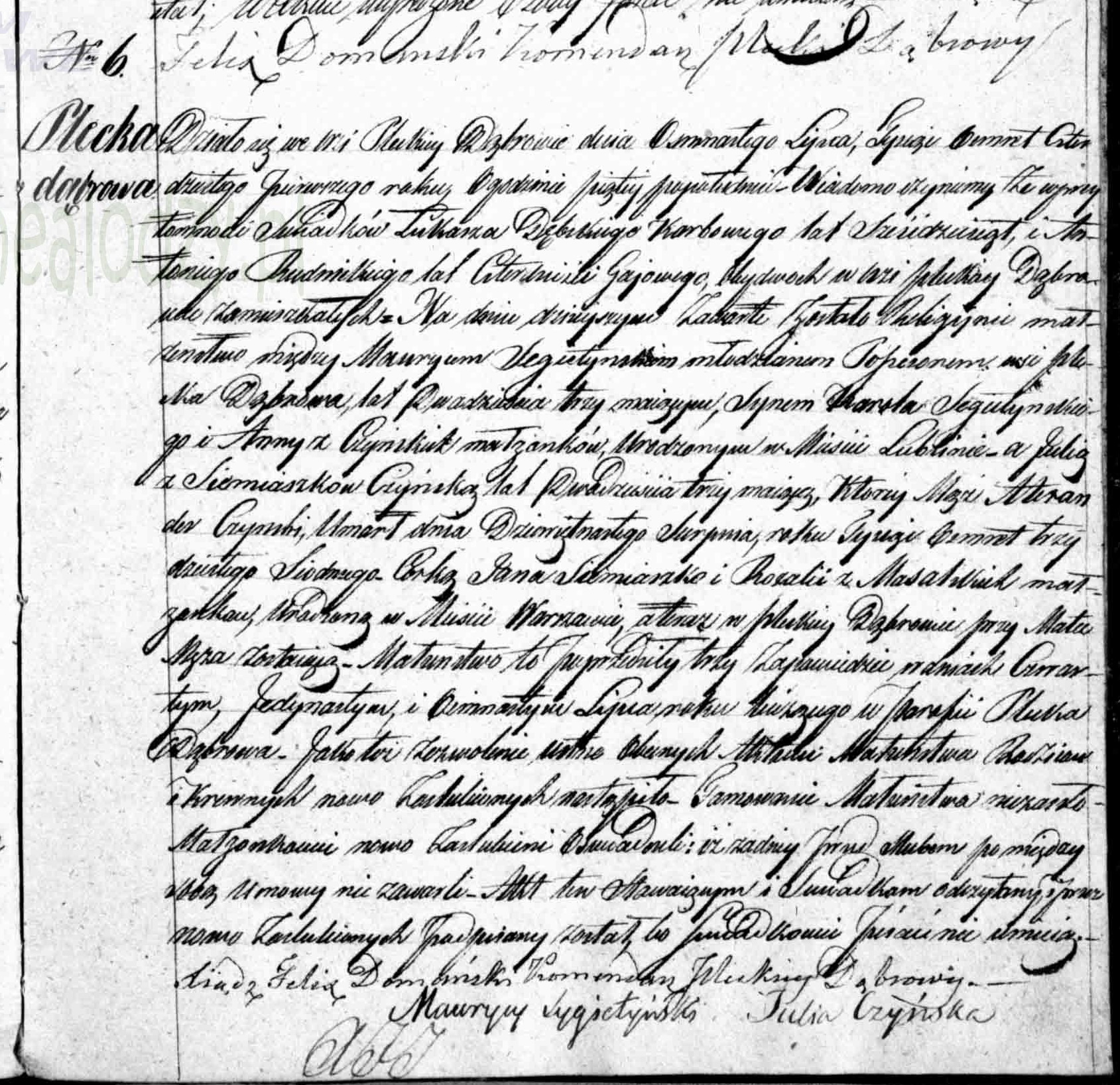 | sw.605263 | sw.598843 (sw.256857) | | | | | | | | | Akt małżeństwa: Plecka Dąbrowa (obecn. woj. łódz.), 6/1841 [indeks na http://geneteka.genealodzy.pl/] http://metryki.genealodzy.pl/metryka.php?ar=3&zs=1627d&sy=1841&kt=2&plik=003-006.jpg [podgląd] |