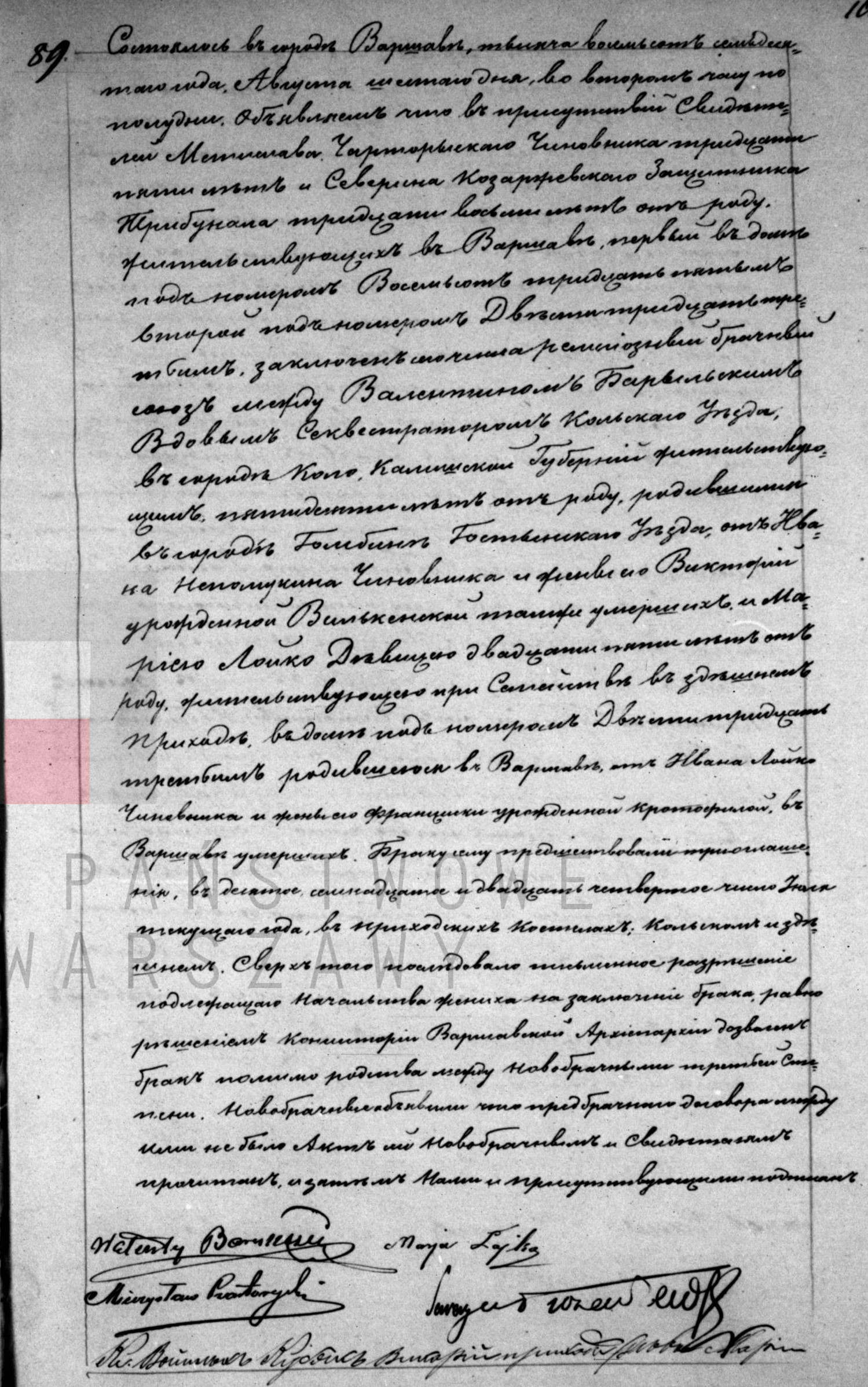 | sw.265278 | | | 1873 | | | | rodzi mu się dziecko | Akt małżeństwa: Warszawa św. Aleksander (obecn. m. Warszawa), 34/1910 [indeks na http://geneteka.genealodzy.pl/] http://metryki.genealodzy.pl/metryka.php?ar=8&zs=9214d&sy=326&kt=1&skan=034.jpg [podgląd] |