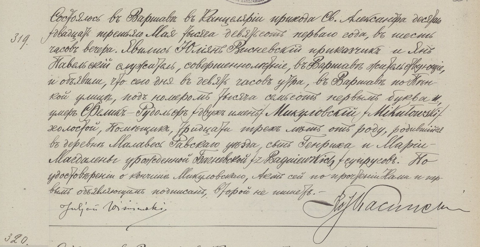 | sw.265693 | m | Henryk | Jan | Józef | | | Mikułowski | | | | | Akt małżeństwa: Warszawa św. Aleksander (obecn. m. Warszawa), 429/1899 [indeks na http://geneteka.genealodzy.pl/] http://metryki.genealodzy.pl/metryki.php?op=kt&ar=1&zs=0162d&sy=1899b&kt=2 [podgląd] |
