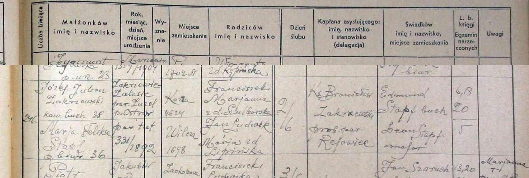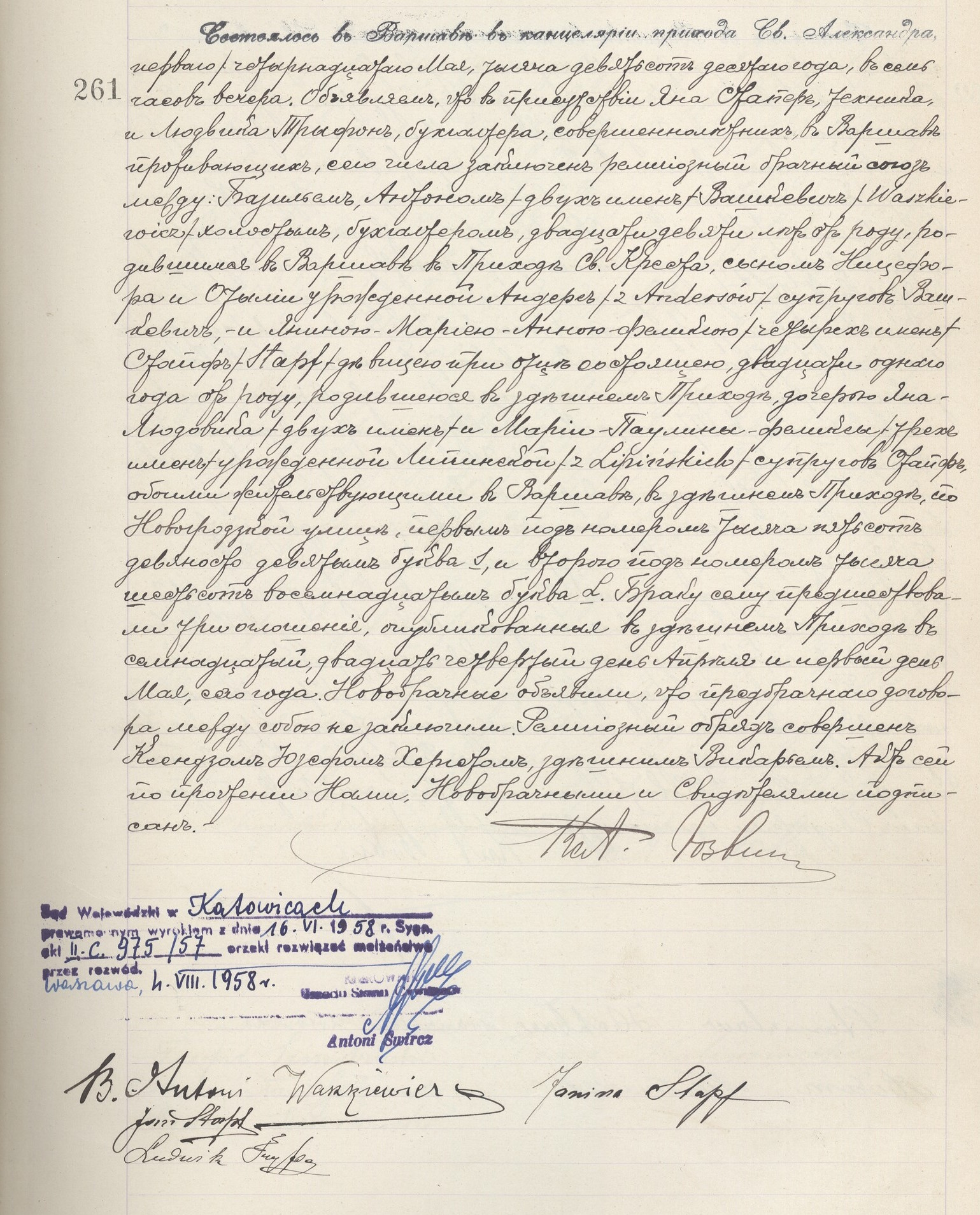 | kozielsk.3966m | sw.271097 | sw.271098 (sw.271098) | sw.271099 (sw.271099) | Akt małżeństwa: Warszawa św. Aleksander (obecn. m. Warszawa), 261/1910 [indeks na http://geneteka.genealodzy.pl/] http://metryki.genealodzy.pl/metryka.php?ar=8&zs=9214d&sy=326&kt=1&skan=261.jpg [podgląd] |