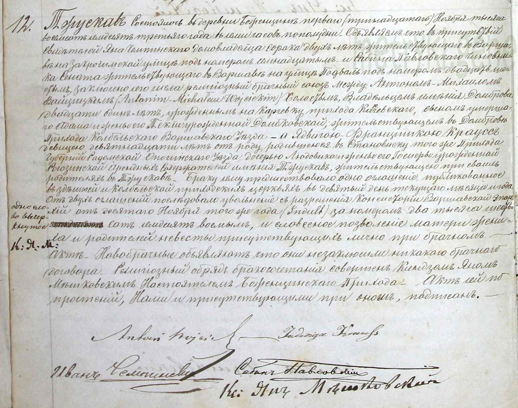 | sw.284818 | sw.623378 | sw.272936 (sw.272936) | sw.272937 (sw.272937) | Akt małżeństwa: Borzęcin (obecn. woj. mazow.), 12/1873 [indeks na http://geneteka.genealodzy.pl/] http://metryki.genealodzy.pl/metryka.php?ar=2&zs=0033d&sy=1873&kt=2&skan=11-14.jpg [podgląd] |