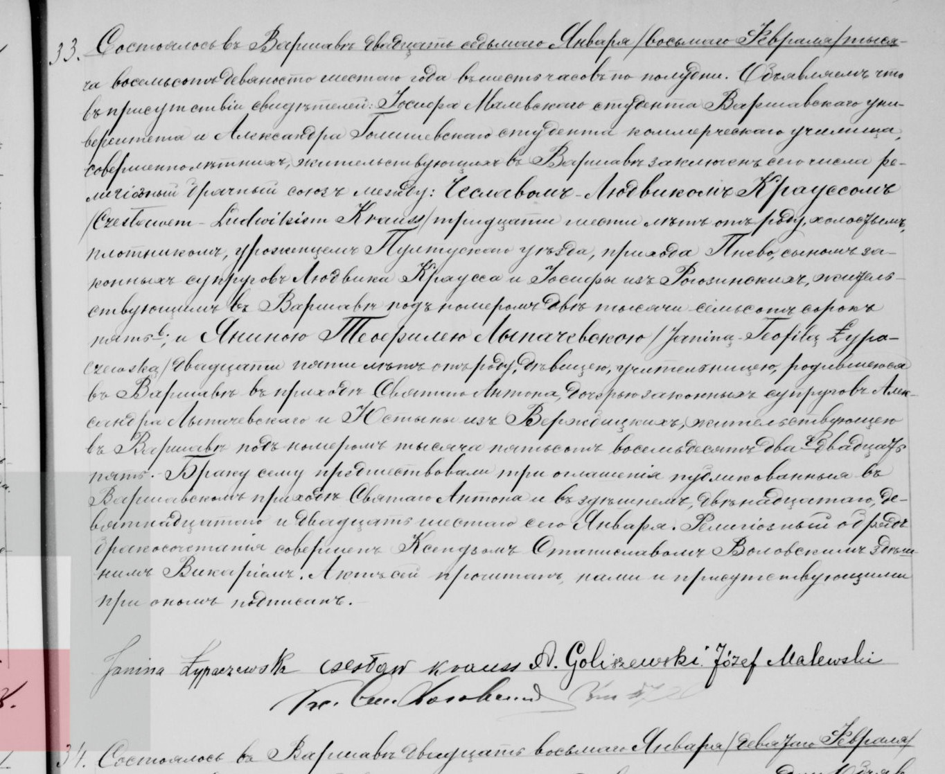 | sw.272941 | sw.272941 | sw.272942 (sw.272936) | sw.272943 (sw.272937) | Akt małżeństwa: Warszawa św. Barbara (obecn. m. Warszawa), 33/1896 [indeks na http://geneteka.genealodzy.pl/] https://szukajwarchiwach.gov.pl/jednostka/-/jednostka/12758716 [podgląd] |