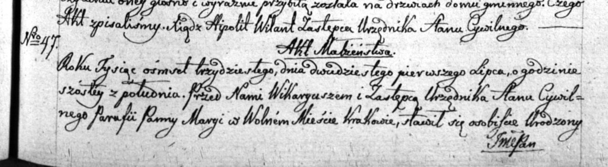 | sw.170964 | sw.275865 | sw.275866 (sw.275776) | sw.275867 (sw.275777) | Akt małżeństwa: Kraków WNMP (Mariacki) (obecn. woj. małop.), 47/1830 [indeks na http://geneteka.genealodzy.pl/] https://szukajwarchiwach.pl/29/328/0/2/79/skan/full/3gRPVgLVOLmk7IihjwXzfw [podgląd] |