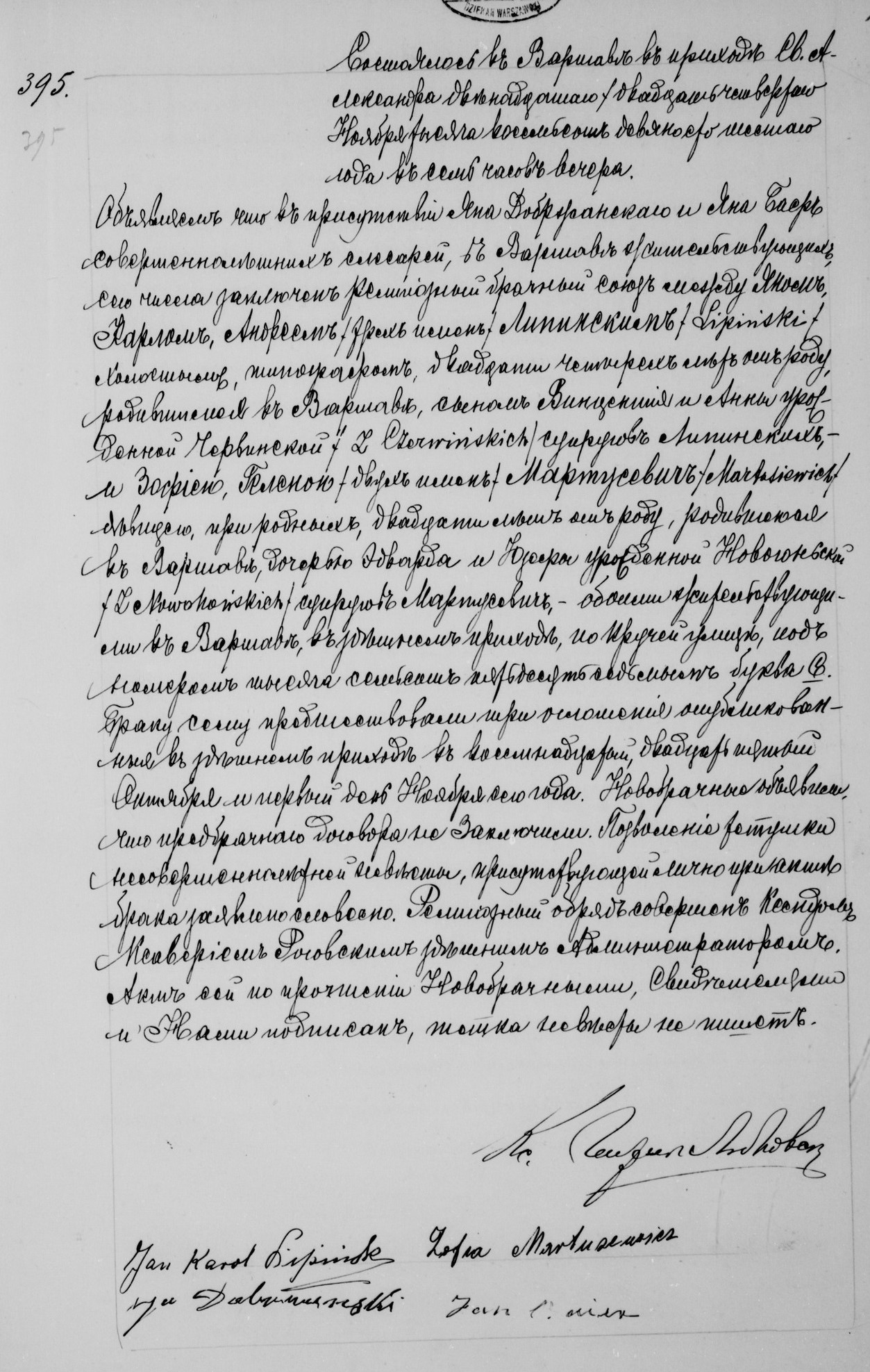 | sw.278392 | sw.278392 | sw.277151 (sw.277151) | sw.277152 (sw.277152) | Akt małżeństwa: Warszawa św. Aleksander (obecn. m. Warszawa), 395/1896 [indeks na http://geneteka.genealodzy.pl/] http://metryki.genealodzy.pl/metryki.php?op=kt&ar=1&zs=0162d&sy=1896b&kt=2 [podgląd] |