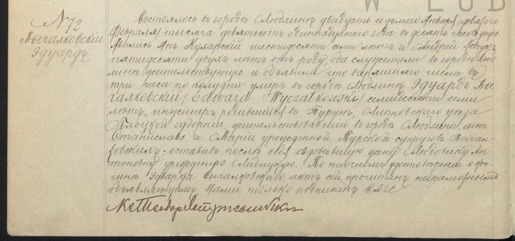 | insertonline.44467 | 8 | feb | 1911 | xpl.lublin | akt 72 https://szukajwarchiwach.pl/35/1859/0/2.4/97/skan/full/_IpbEZtSA-V3yrjoWqvZFA -- Informacja p. Marty Woźniak (z 12.3.2020) | Uzupełnienia użytkowników wprowadzane online | ||